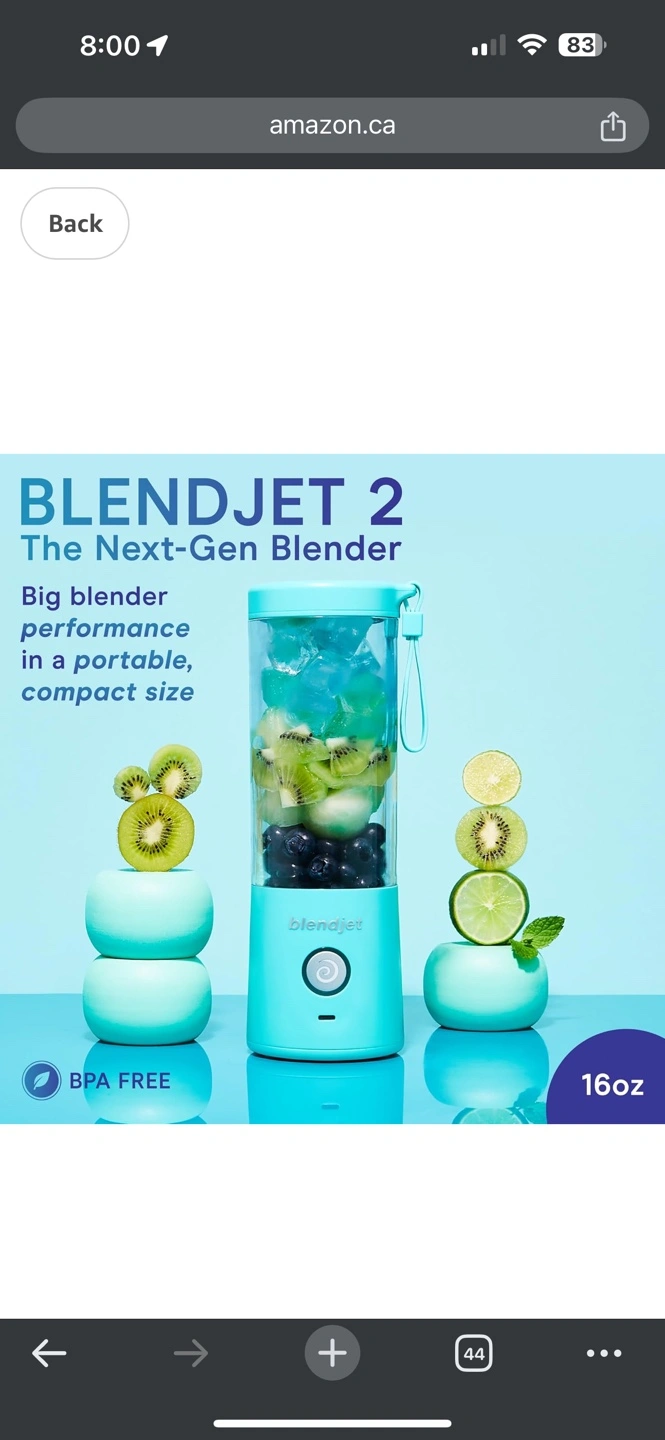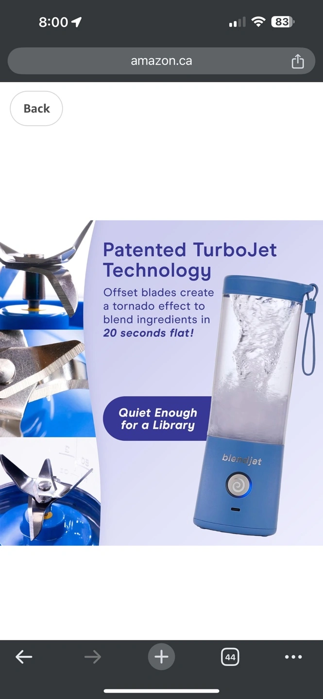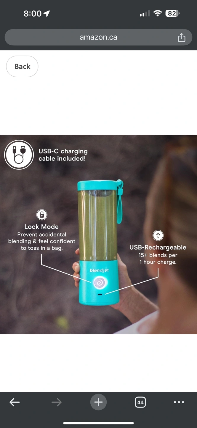 Portable blender. USB-C rechargeable. BPA free. 16oz capacity. Self-cleaning. Patented TurboJet technology. Blends in 20 seconds. Includes USB-C charging cable.