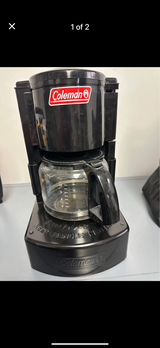 Portable coffee maker. Great for camping. Makes 10 cups. Drip style brewer. Black plastic housing and glass carafe.