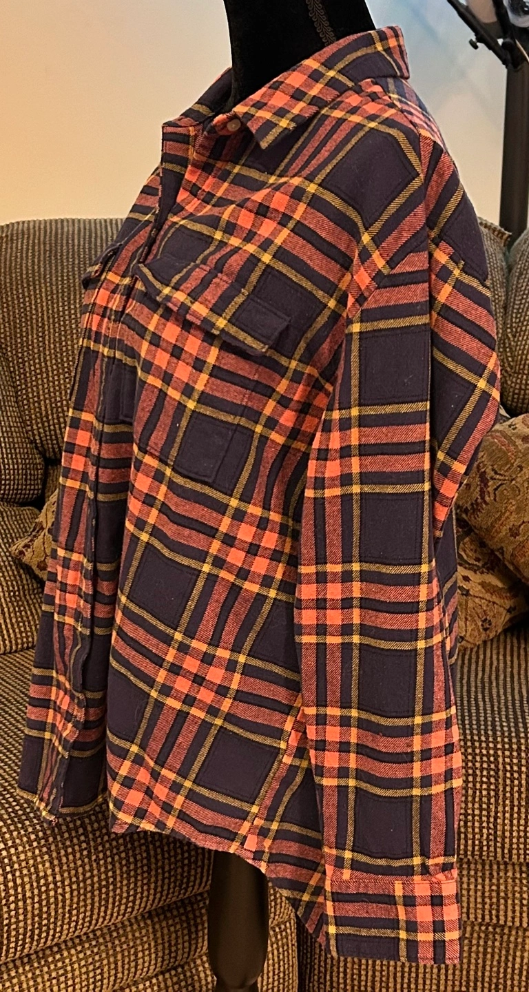 Women's Old Navy Boyfriend shirt. Size large. Long sleeves. Plaid pattern in navy, orange & yellow. Button-down closure. Chest pockets.