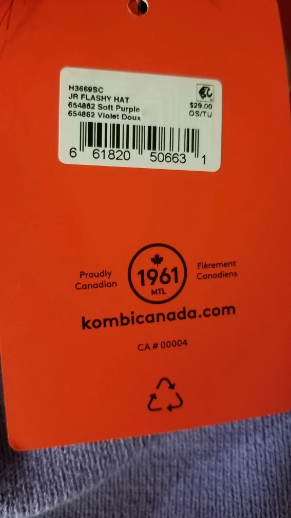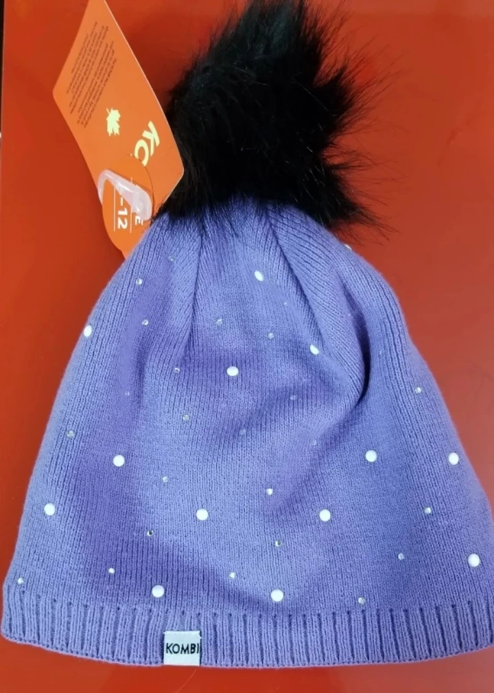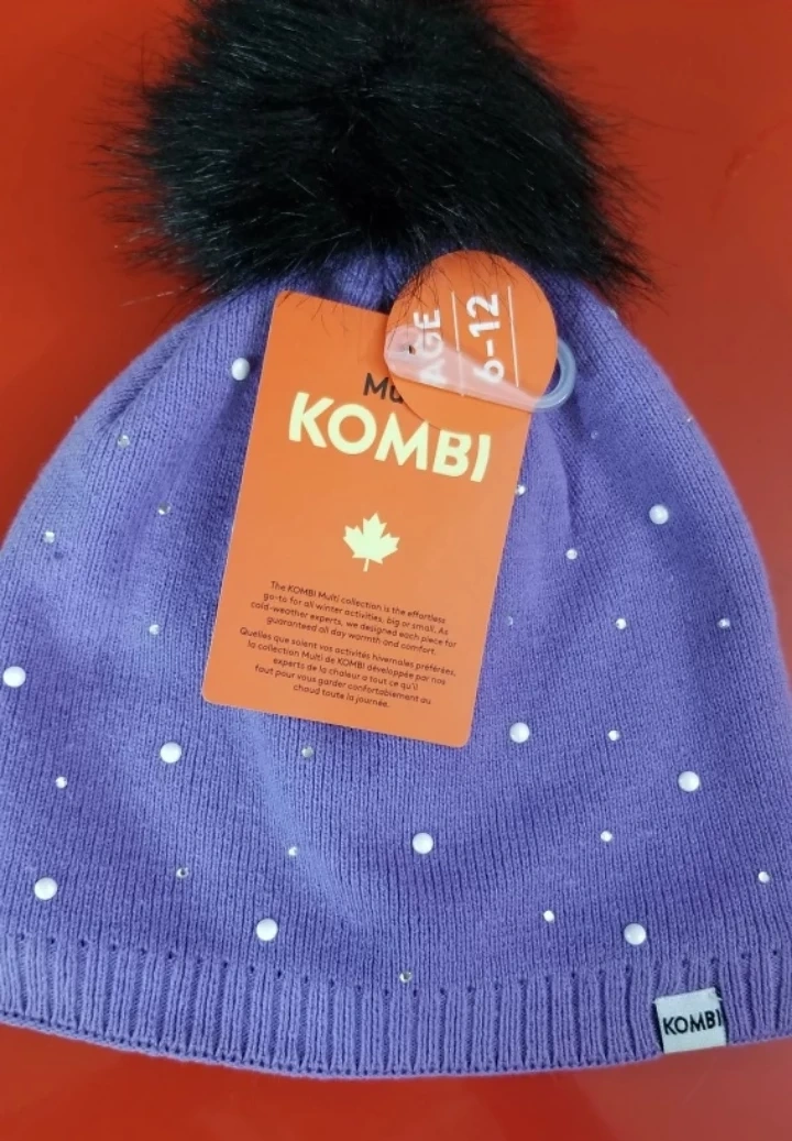 Girls' purple knit beanie. Features white and silver shininng rhinestones and a black pom-pom. Size 6-12. New with tags. Bought it 29$ plus tax.