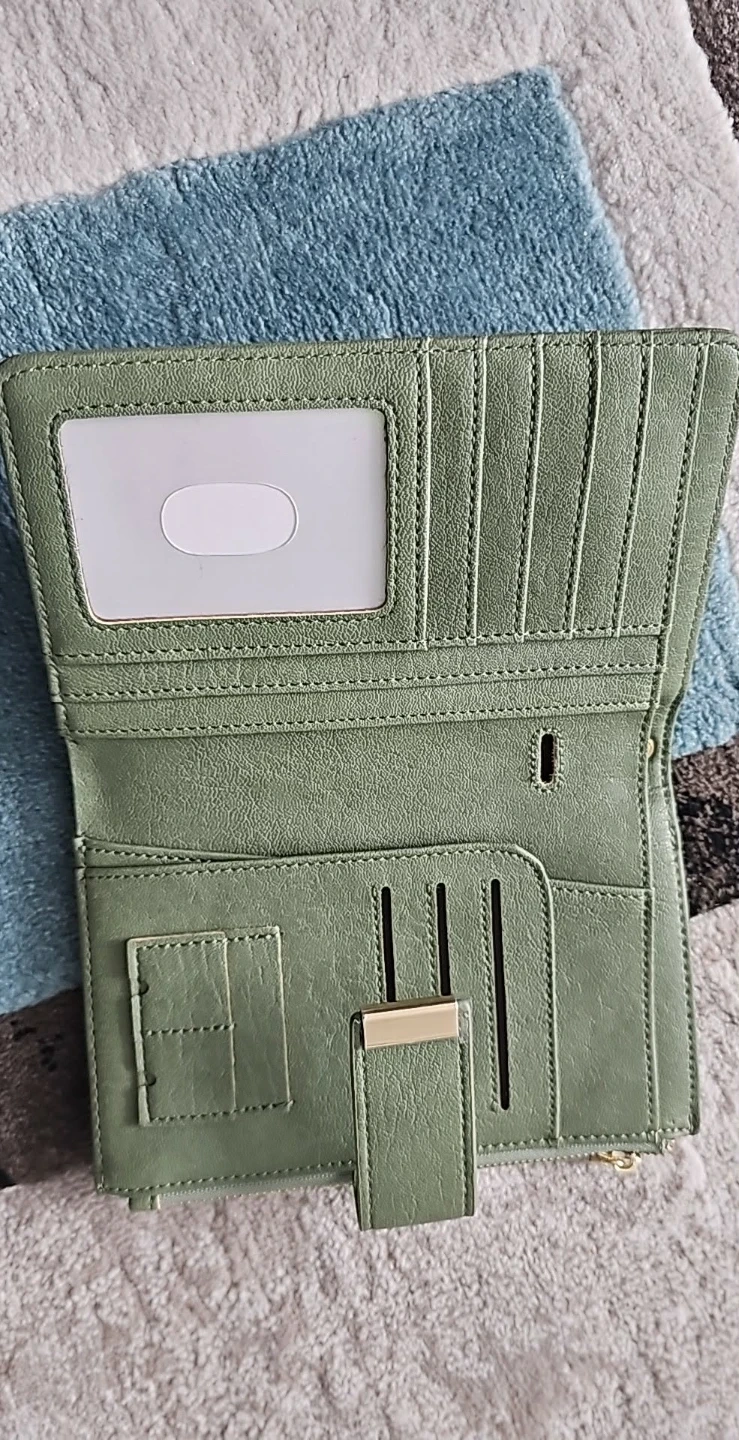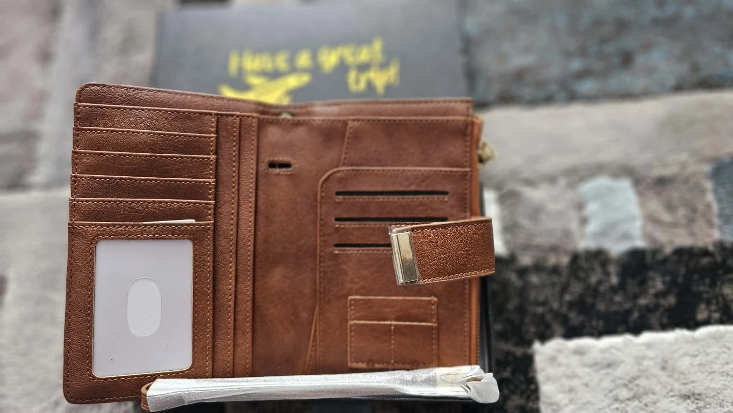 leather bifold wallet. Multiple card slots and cash compartment. Features RFID blocking technology. Includes matching keychain and lanyard.