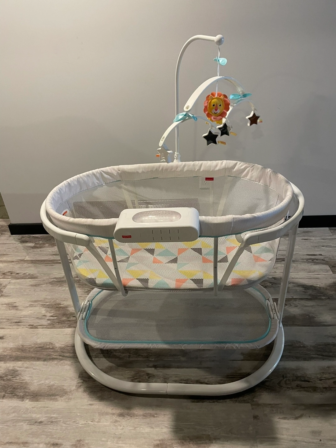 Baby bassinet with soothing vibrations. Includes mobile. Geometric patterned mattress included. Can include bassinet sheets as well if you want. Excellent condition.