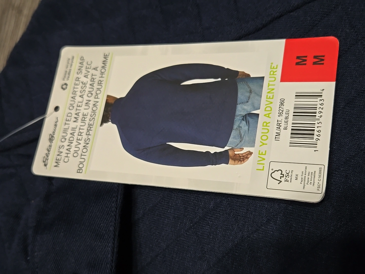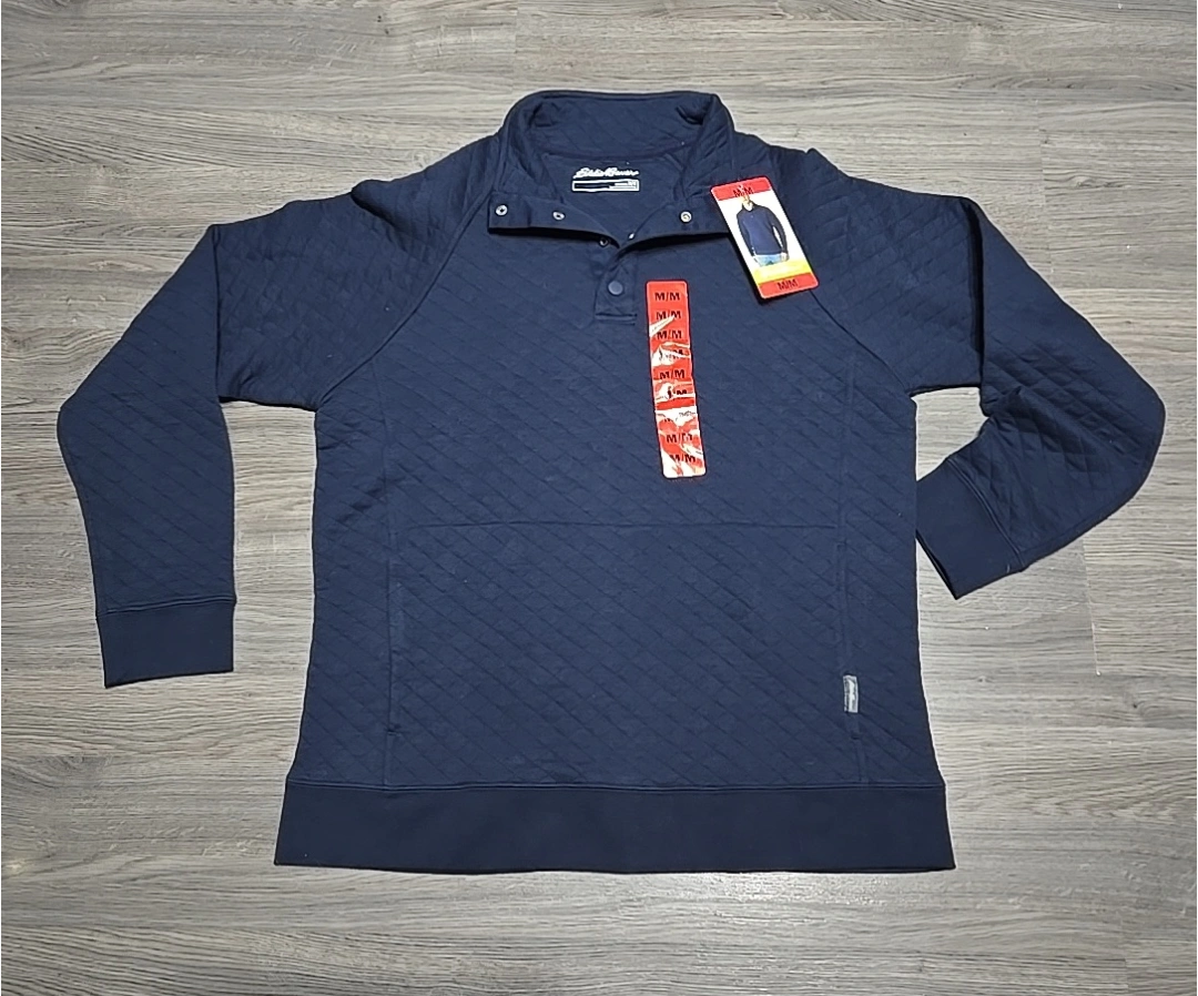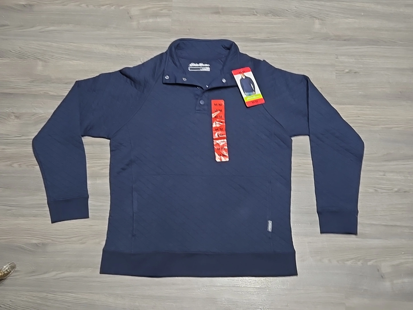 Men's medium quilted sweater. Navy blue colour. Long sleeves. Snap button placket. Kangaroo pocket. New with tags.