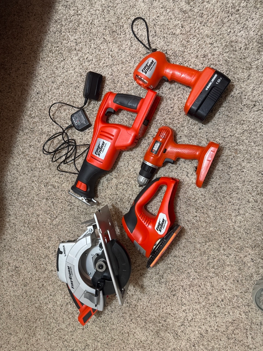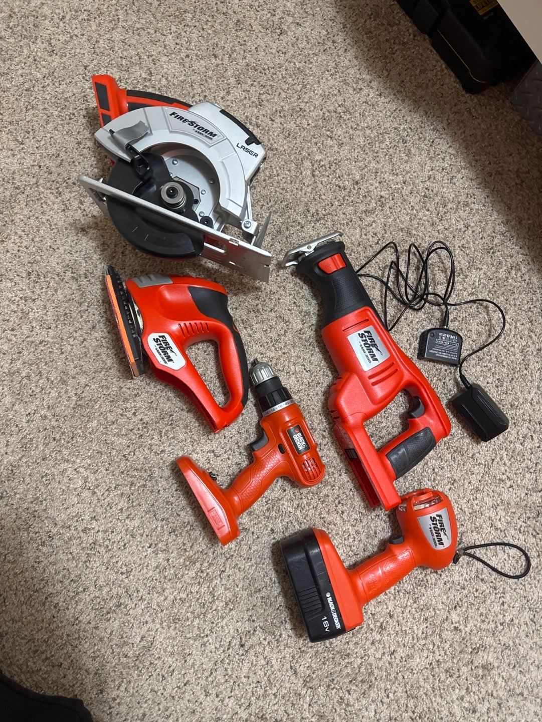 Five-piece cordless power tool kit. Includes reciprocating saw, drill, circular saw, sander, and work light. All tools are 18V. Excellent for DIY projects. Battery and charger included, the battery don’t hold the charge too long