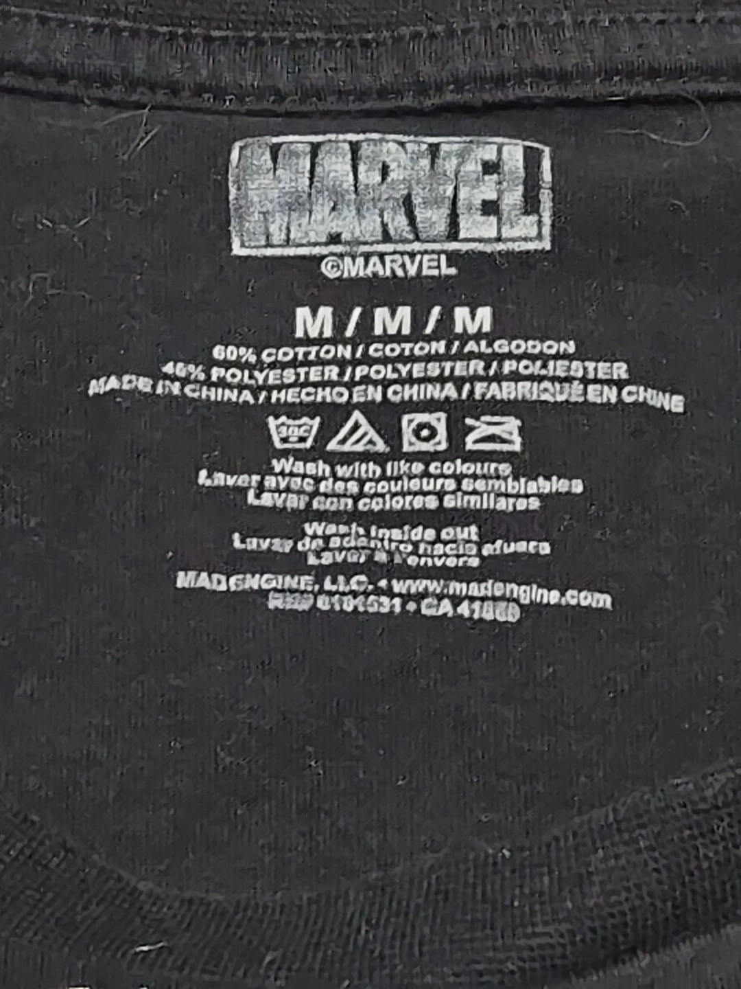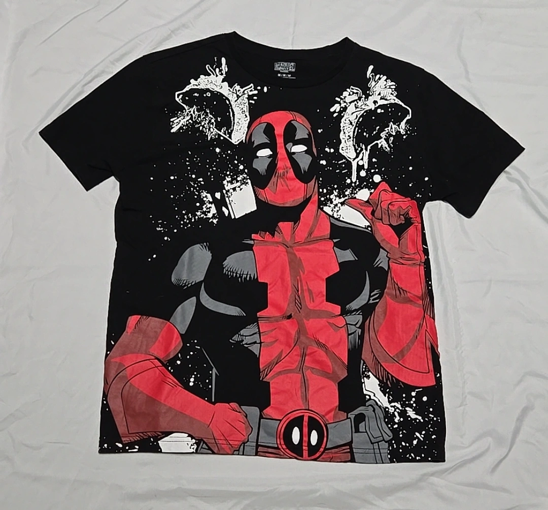 Men's medium Marvel Deadpool graphic tee. Black shirt, red and black Deadpool image. Made in China. 60% cotton, 40% polyester.