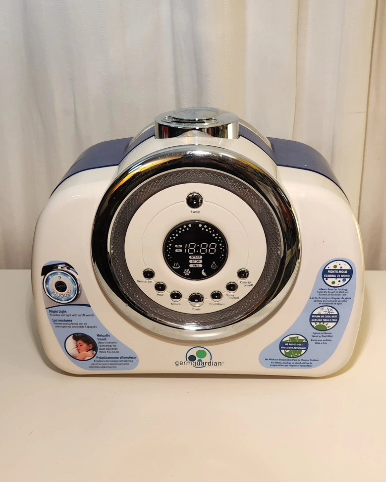 349Ultrasonic humidifier. Features night light, digital display, and various settings. Cool and warm mist options.