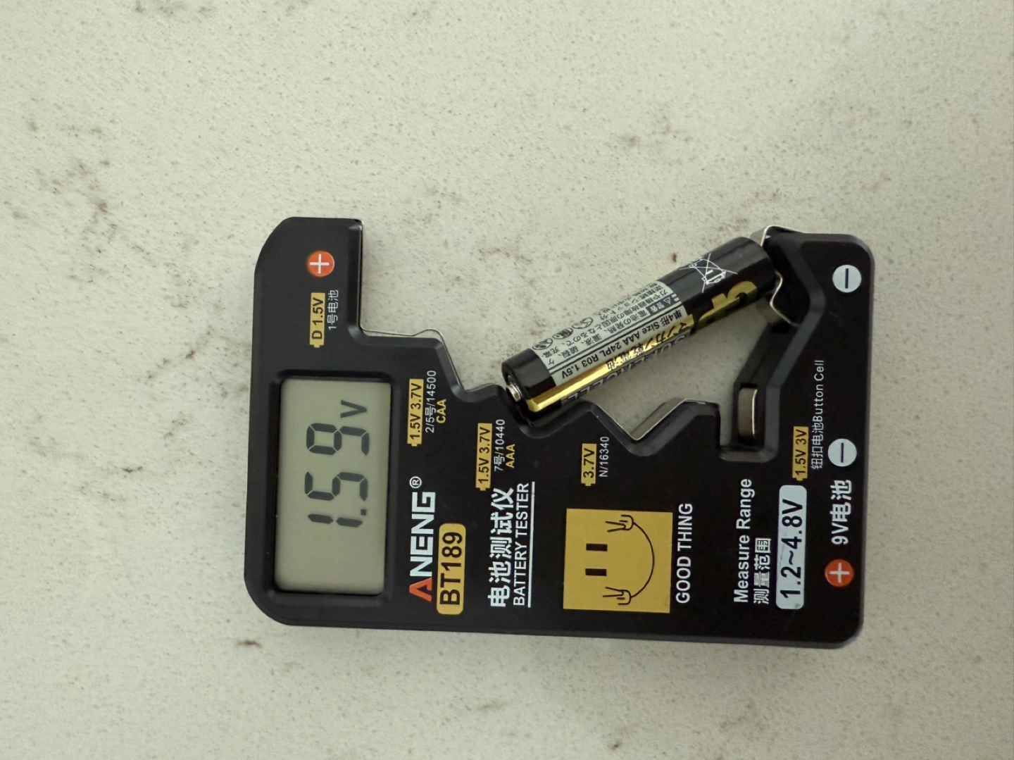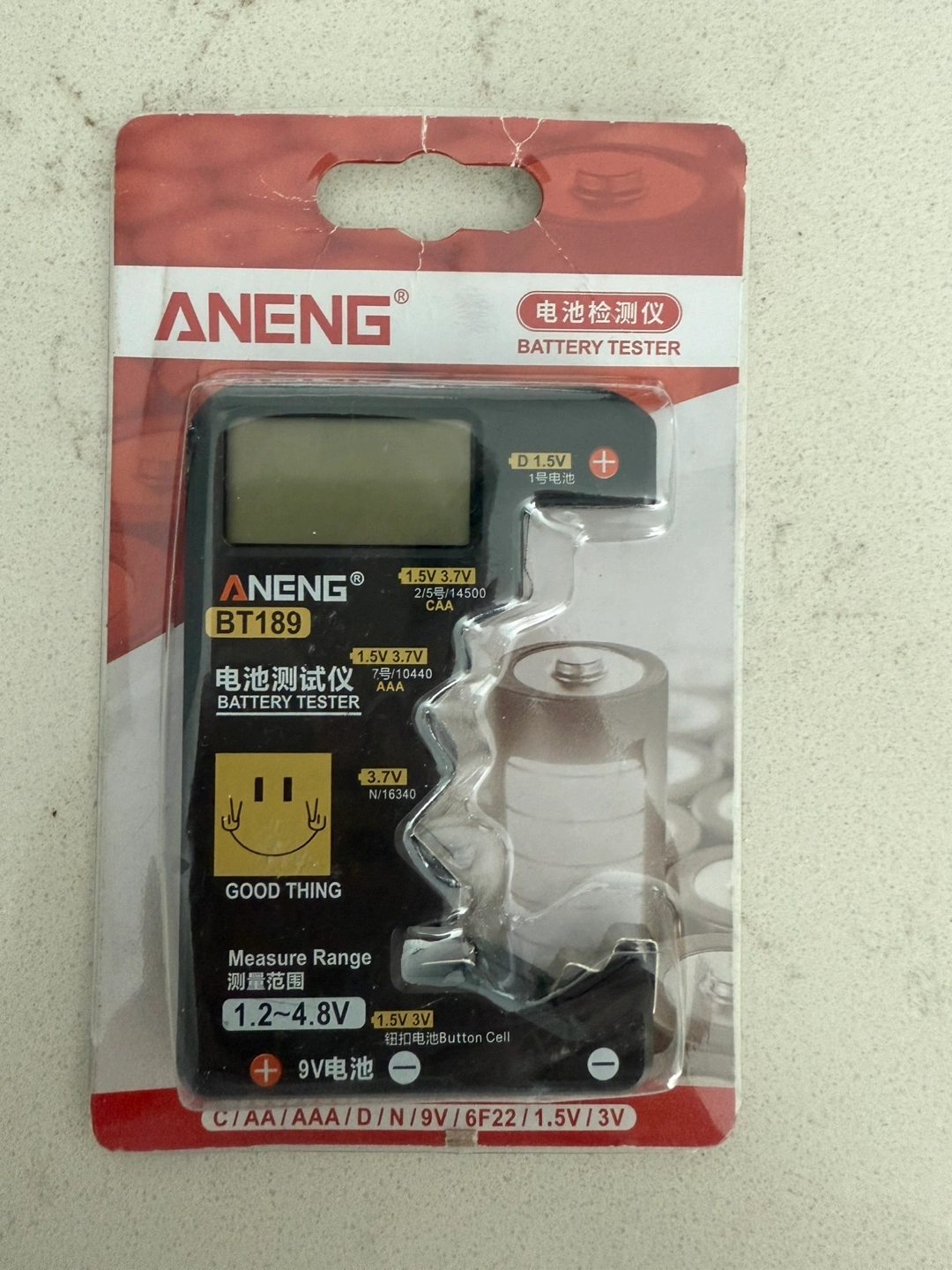 Compact battery tester. Measures 1.2-4.8V. Tests various battery types. Digital display. Handy device.