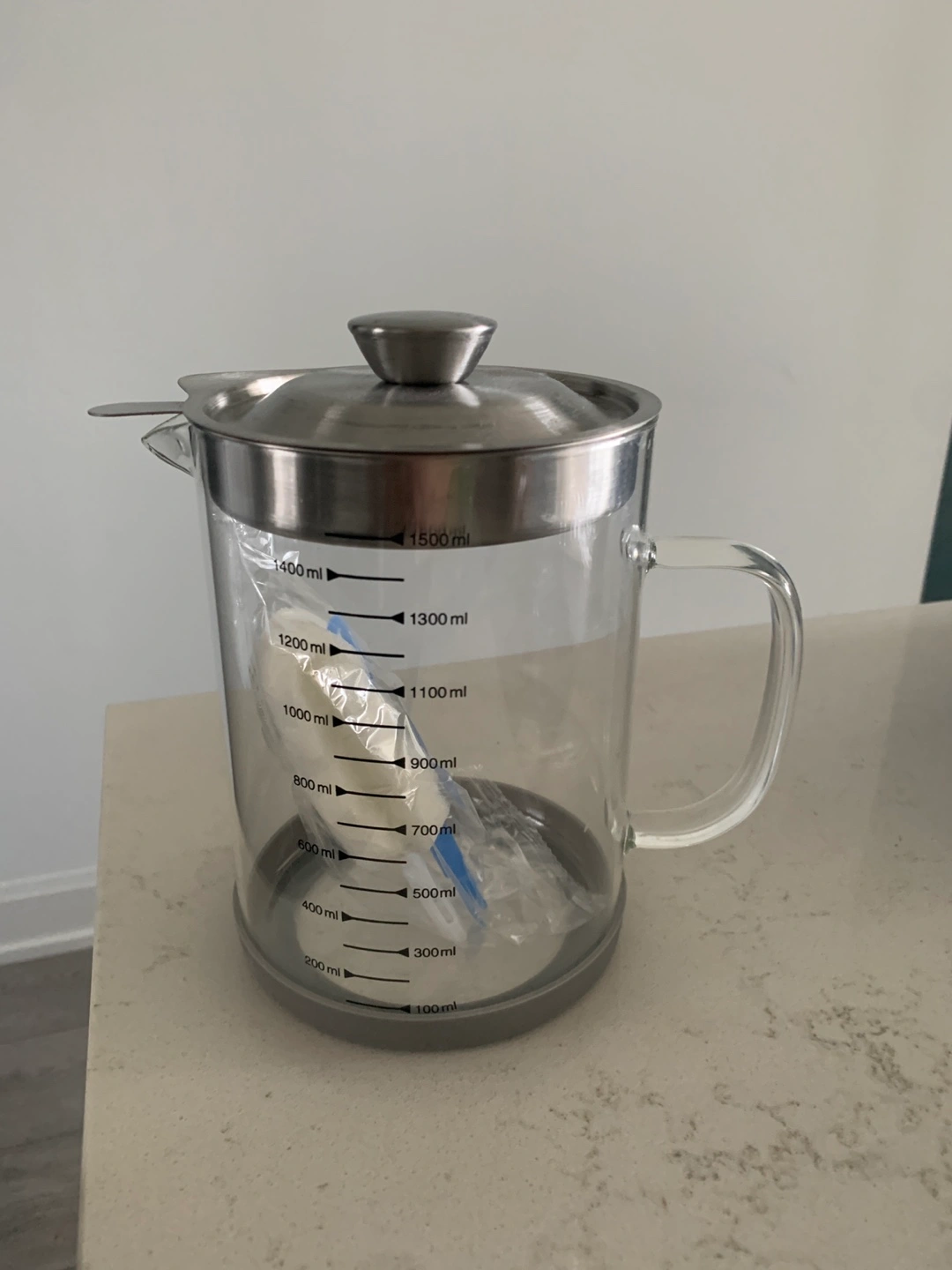Large capacity glass oil pot. Stainless steel lid and strainer. Measurements marked on side. Perfect for storing and pouring oil.