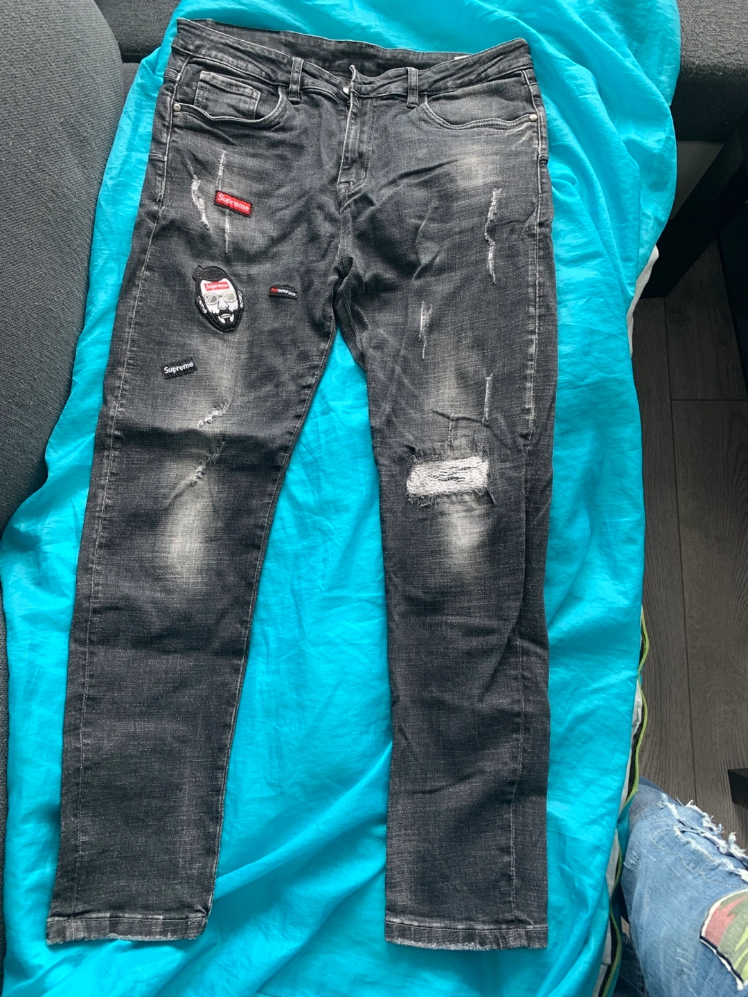 Men's slim-fit distressed jeans. Dark wash denim with various Supreme-inspired patches. Multiple intentional rips and distressing throughout. Great for a streetwear or casual look.