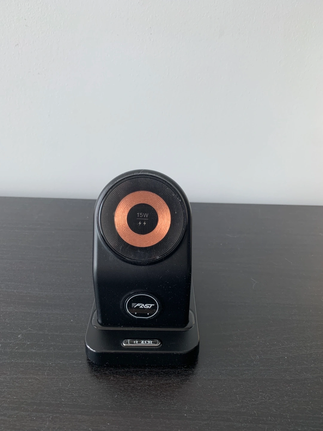 Wireless charging stand. Features a built-in LED night light. Includes USB charging cable. Compact and convenient for bedside use.
