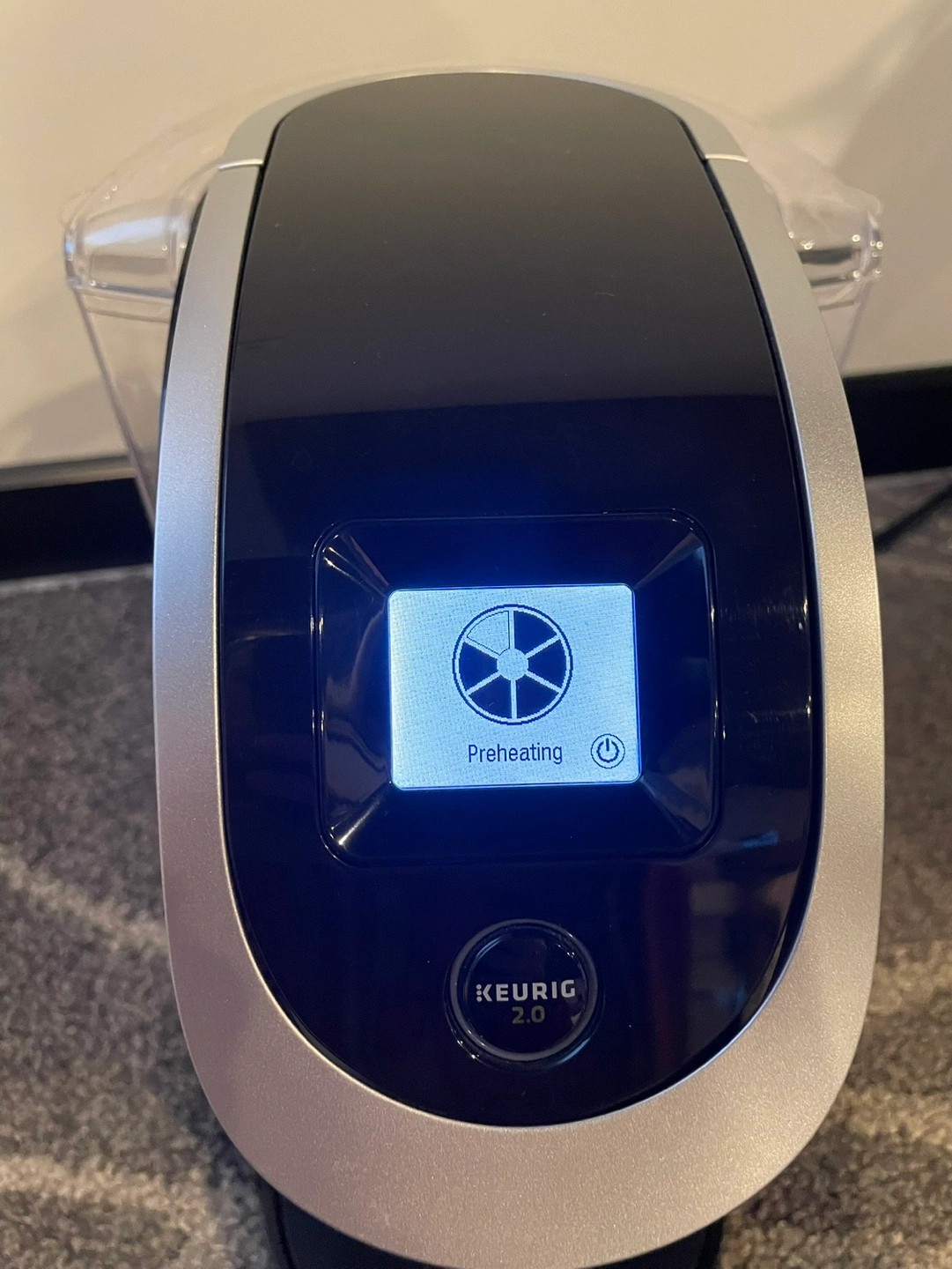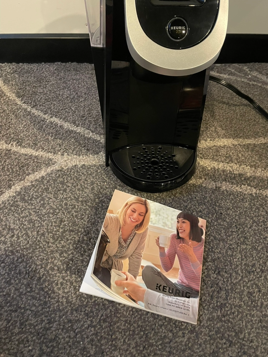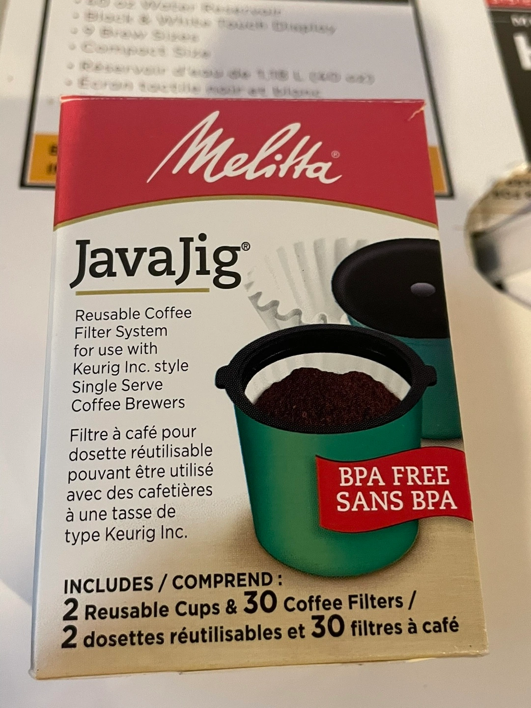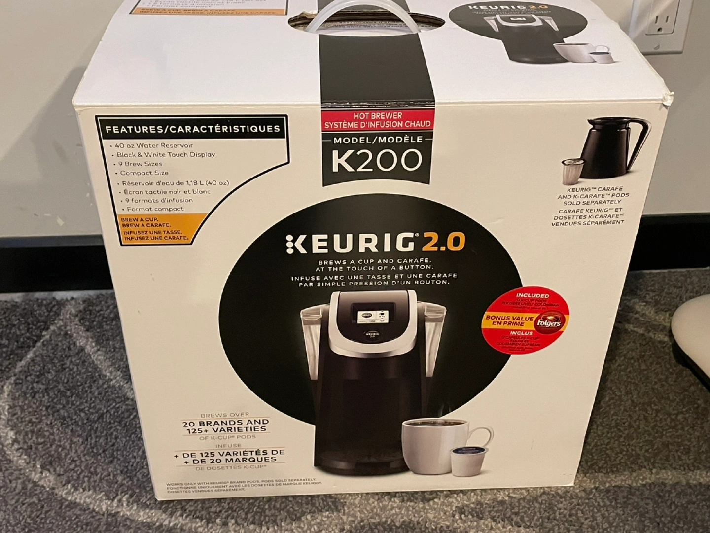 Keurig K200 single-serve coffee maker. Brew a cup or carafe. Includes 1 water filter cartridge and reusable JavaJig coffee filter system with filters. Black and silver.