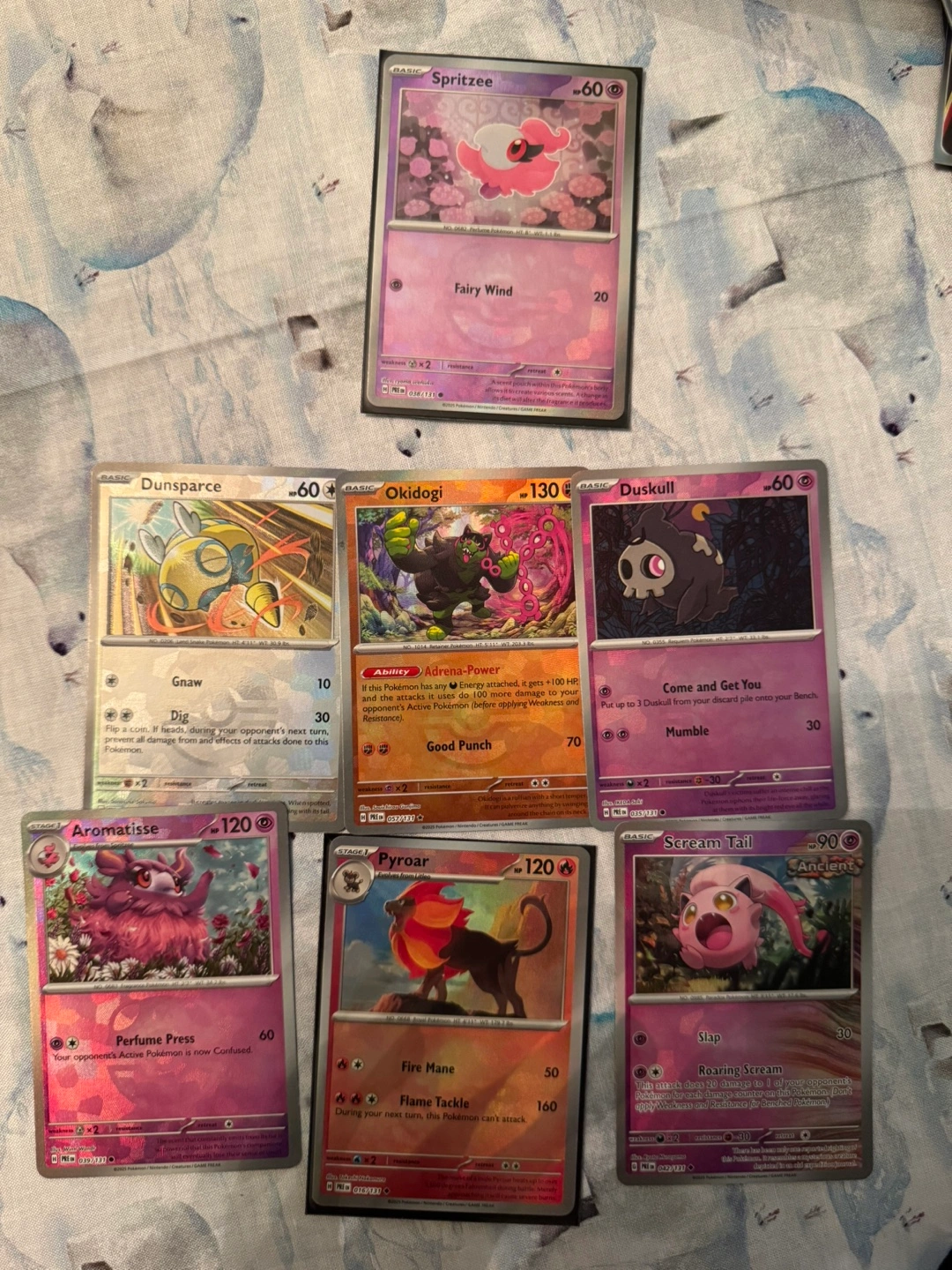 138Six Pokemon cards. Includes Spritzee, Dunsparce, Okidogi, Duskull, Aromatisse, and Pyroar. Various rarities and HP values. Master ball Variants