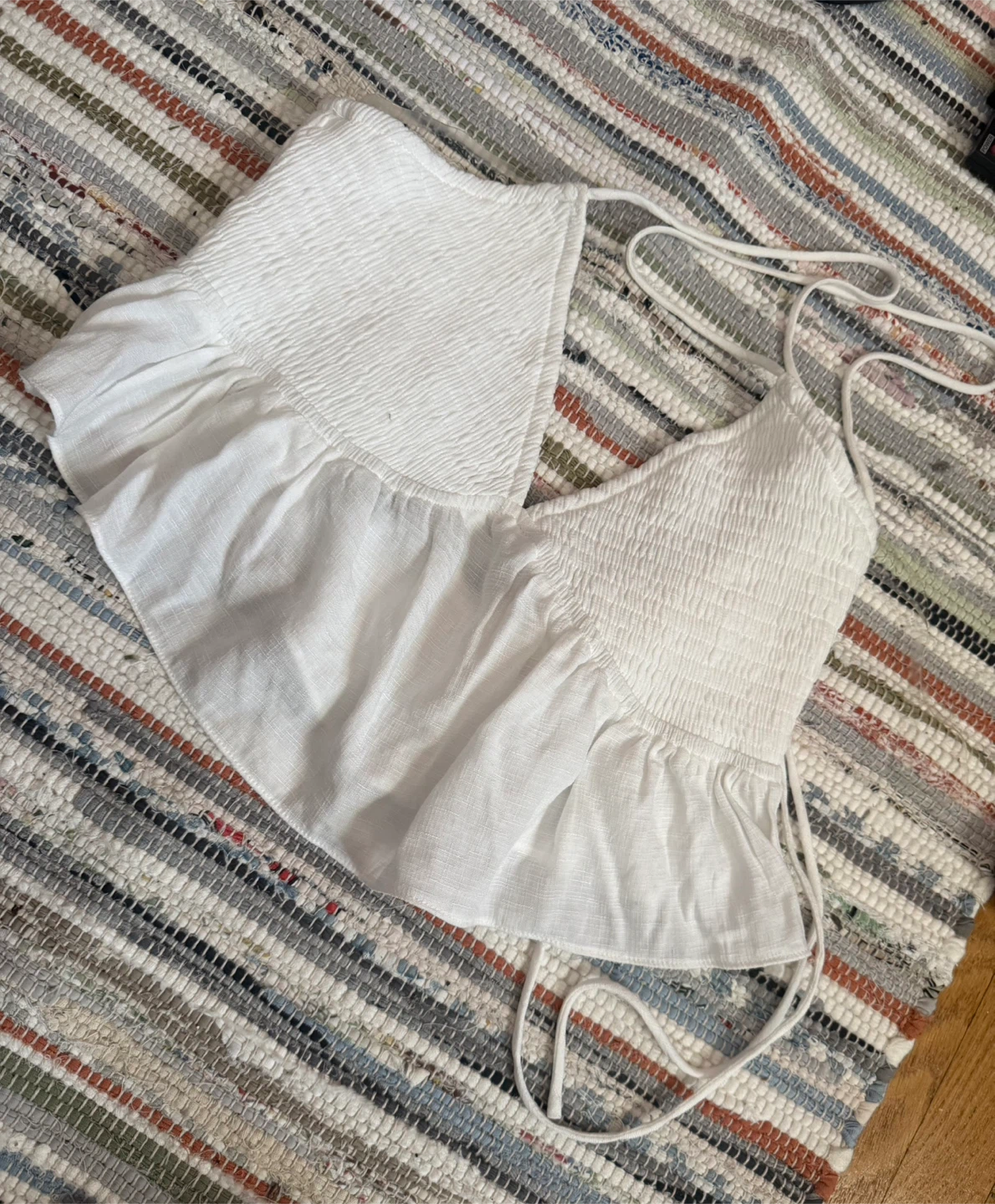 A cute white camisole top with smocking on the bodice and a ruffled hem. It features thin adjustable shoulder straps. The fabric is lightweight and breezy. It's perfect for warm weather outfits!