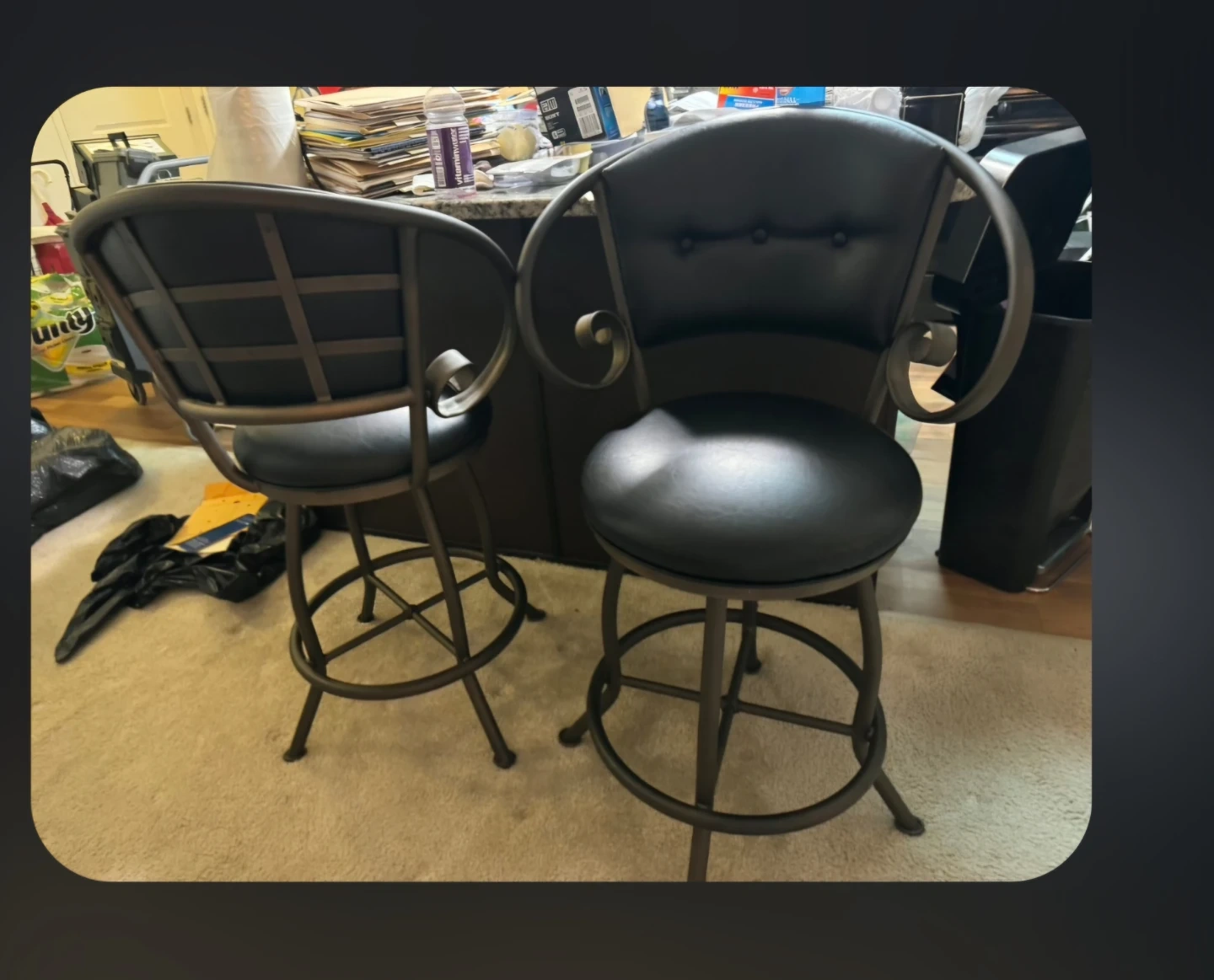 These two bar stools feature black faux leather upholstery and a metal frame. They swivel and have a comfortable, padded seat and backrest. These stools are great for a kitchen island or home bar.