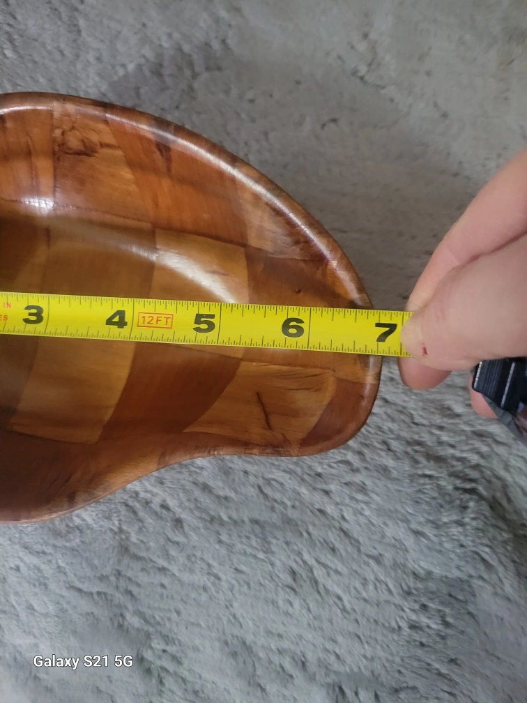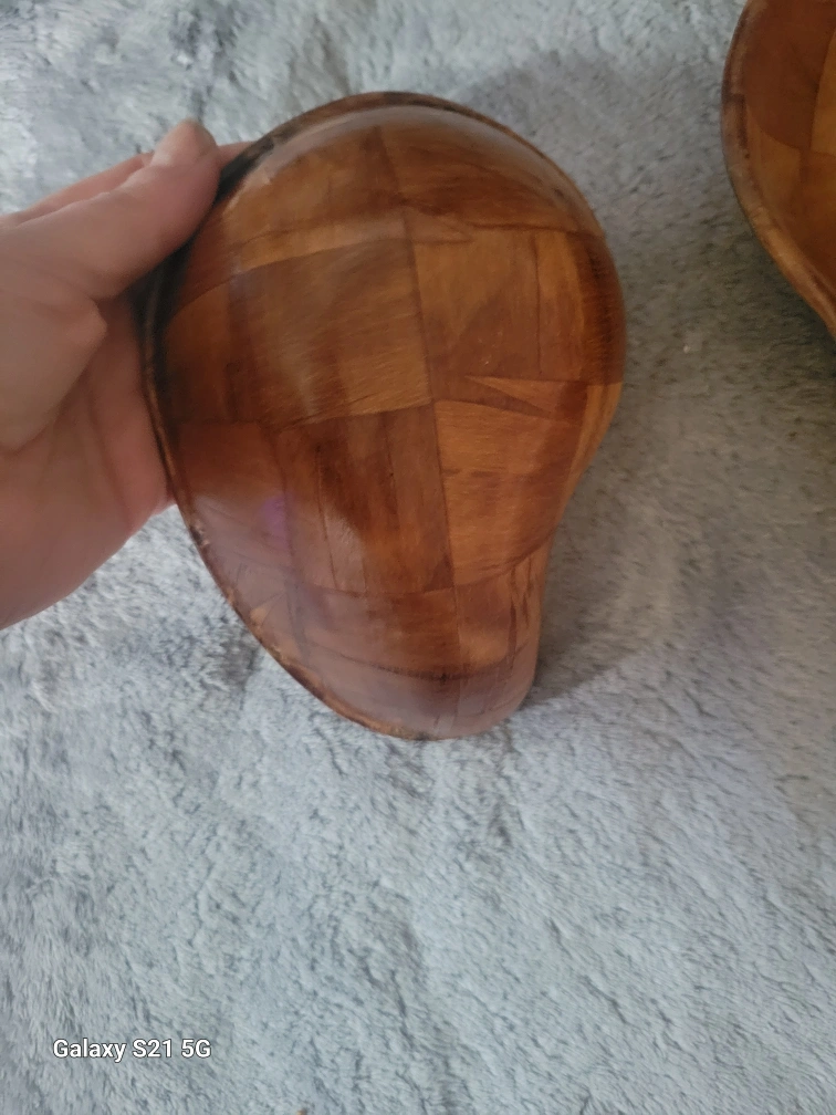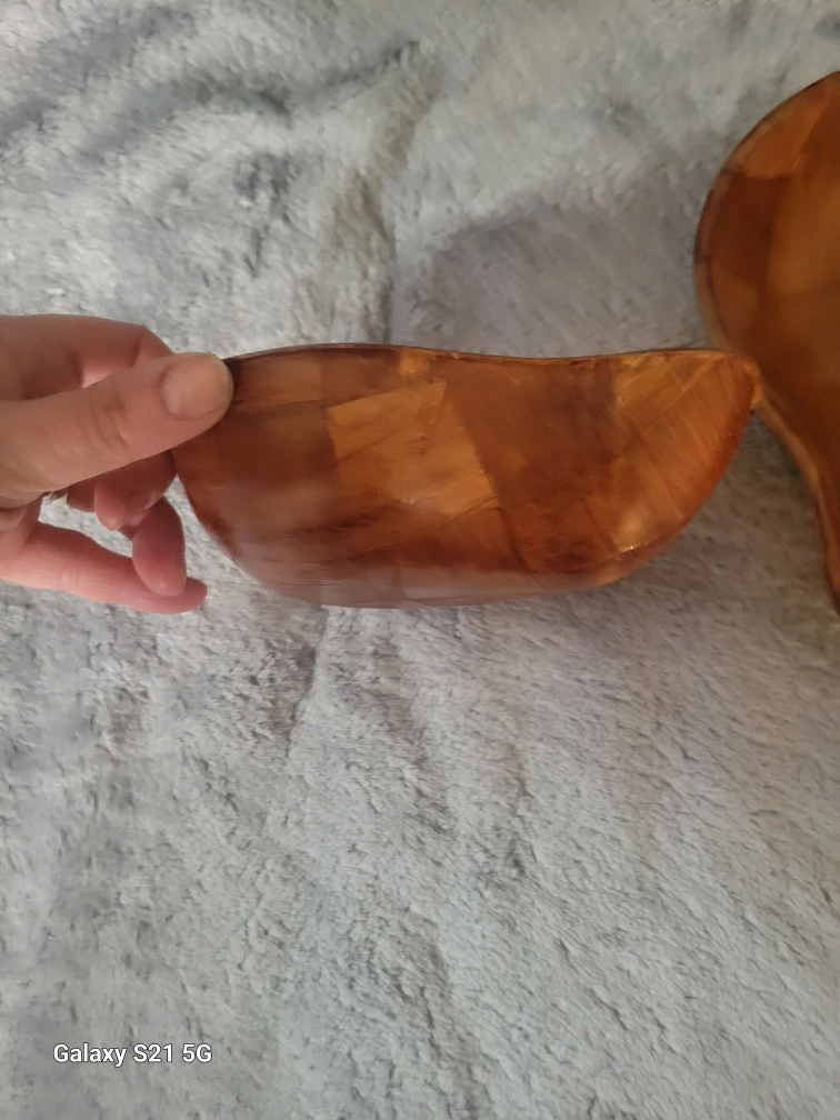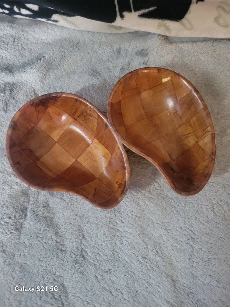 Two uniquely shaped wooden bowls. Approximately 7 inches long. Woven wood design. Great for serving or decoration.