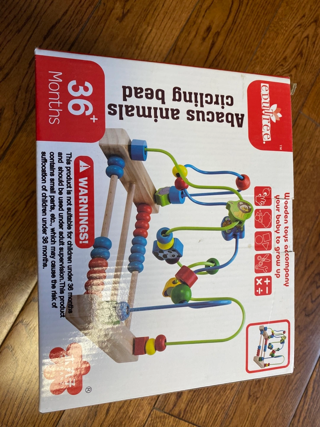 Wooden abacus toy. Colorful beads and animals. Suitable for children 36 months+. Develops fine motor skills.
