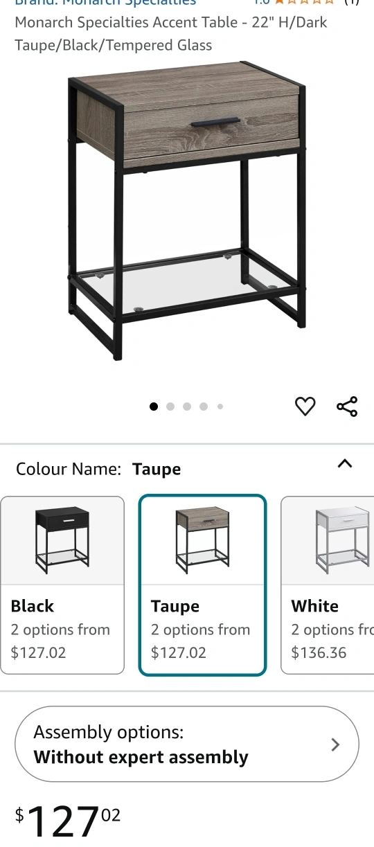 Small accent table, taupe finish. Features one drawer and a lower glass shelf. Metal frame.