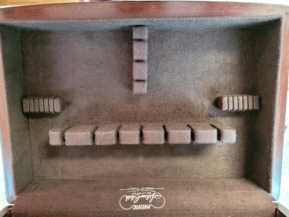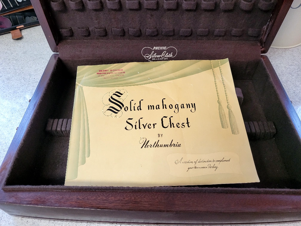 Solid mahogany silver chest. Lined in satin & 'silver cloth' to prevent tarnish. (Contained S.S. pieces for past 15 yrs that never ever tarnished) Solid brass handles & name plate