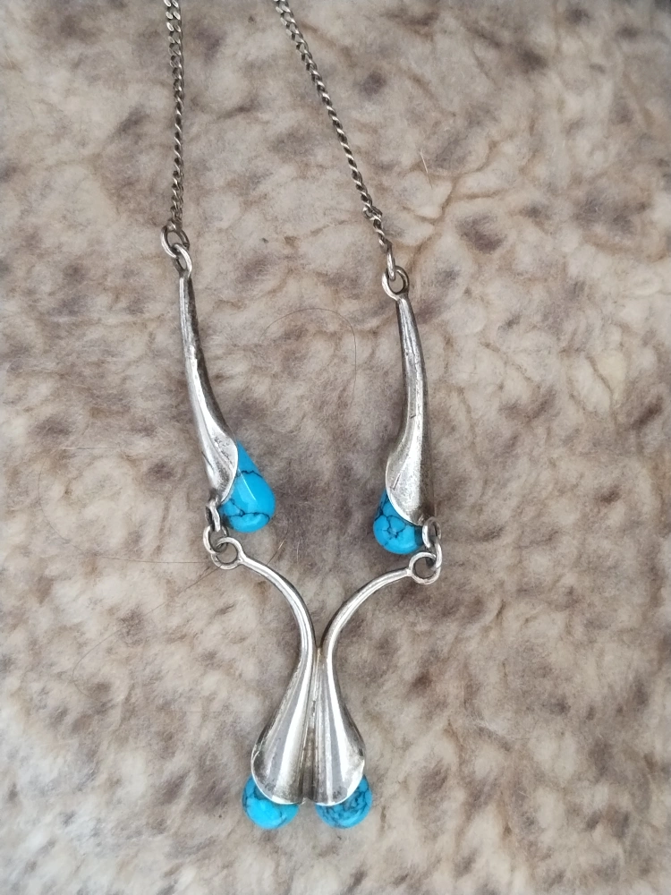 Uniquely designed vintage necklace from Poland. Features three teardrop turquoise stones in sterling silver sconce like settings. AI has suggested the price range between $65-$110 ..... photos show front and back views.