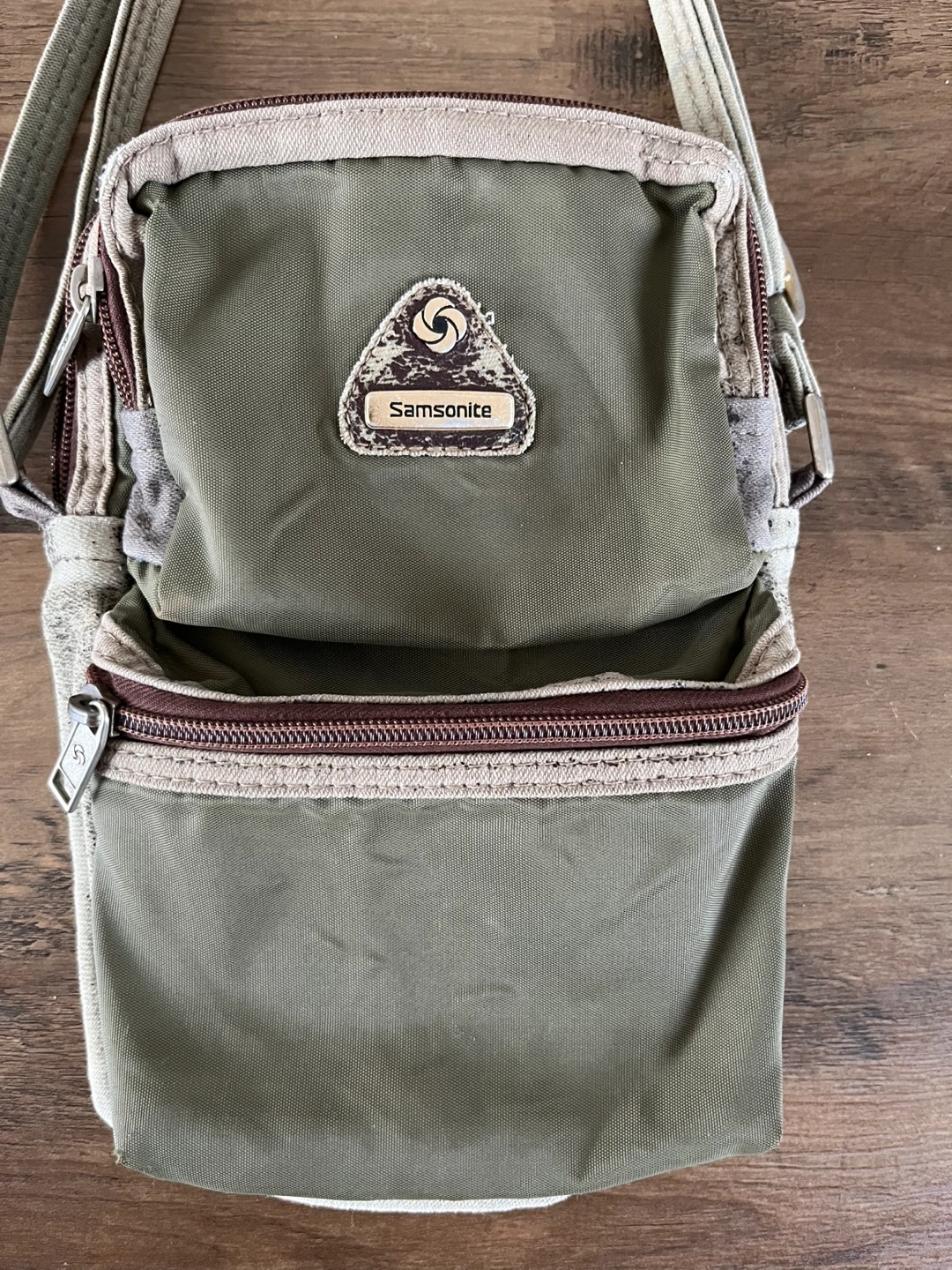 676Small crossbody bag. Olive green with beige accents. Two zippered compartments. Adjustable shoulder strap. Shows wear a vintage object from the sixties!