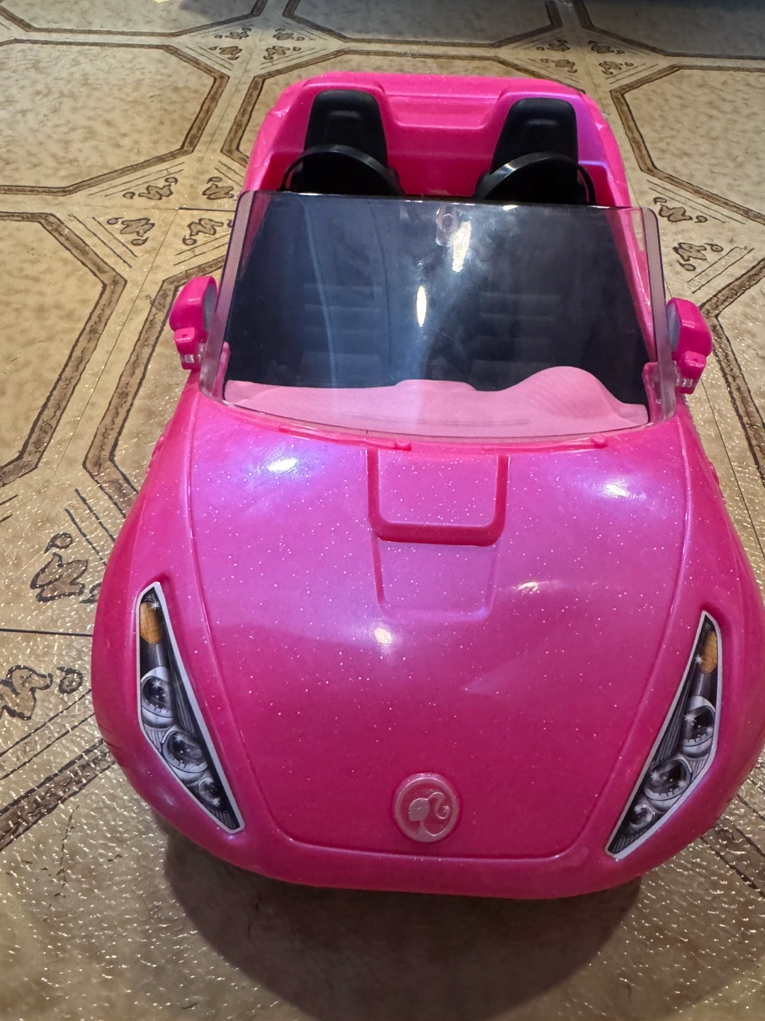 Pink convertible toy car. Two seats, black interior. Glitter finish. Good condition. For Barbie or similar dolls.