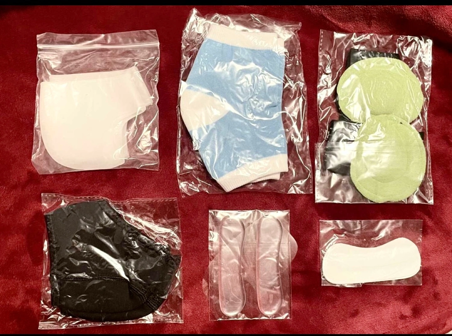 Plantar fasciitis pain relief kit. Includes compression foot sleeves, cushioned arch supports, therapy wraps, gel heel cushions, silicone gel heel protectors, and fabric heel grips. Medical-grade materials. New, unused.