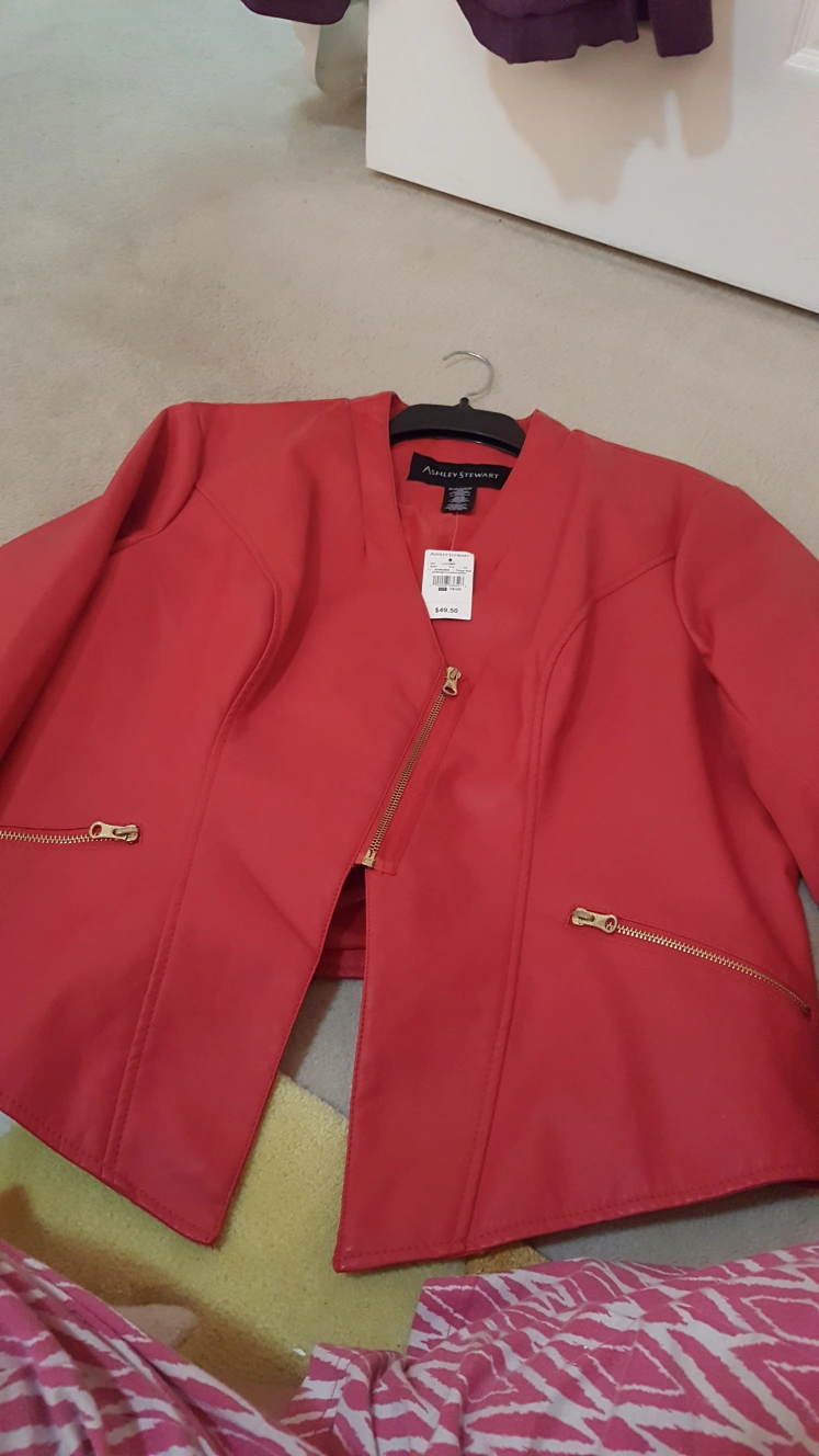 Women's red faux leather jacket. Asymmetrical zipper closure. Gold-tone hardware. Two zippered pockets. Size 18/20. New with tags.