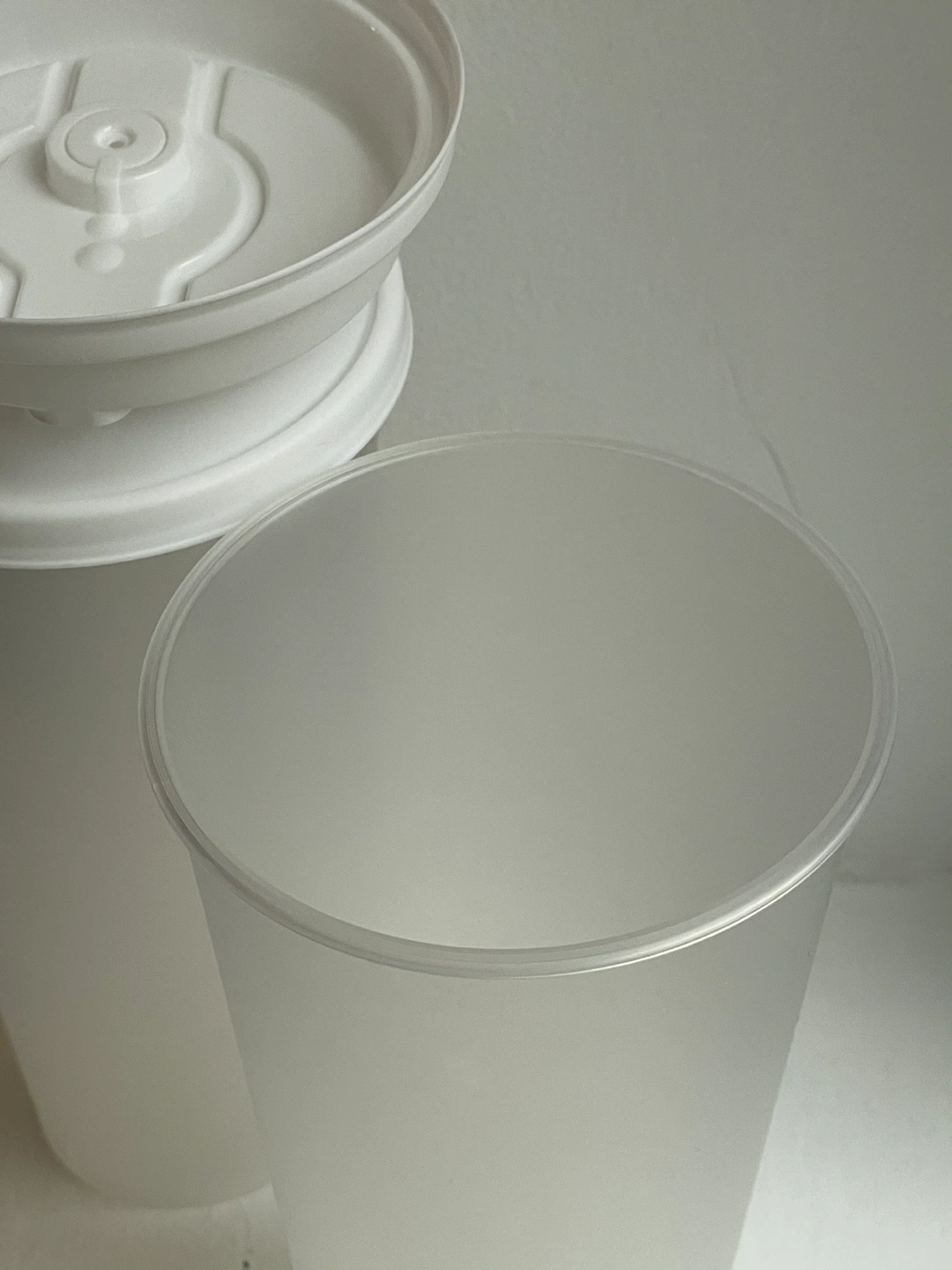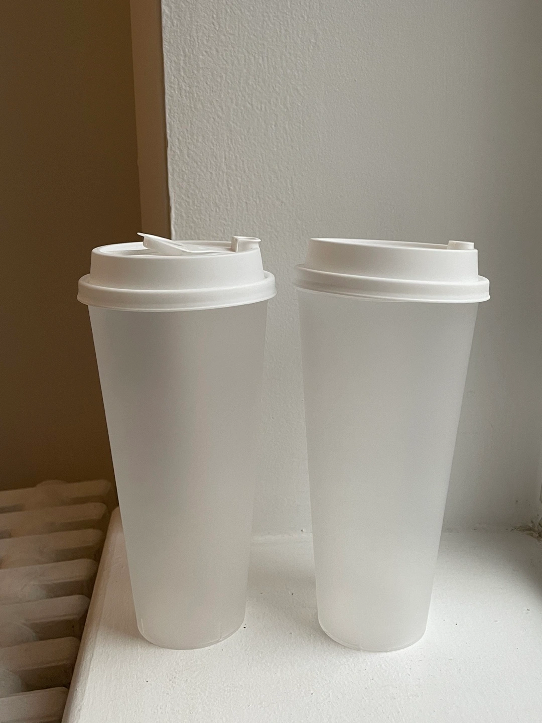 Set of two frosted white plastic cups. Each cup includes a white plastic lid with a small flip-top opening. Great for cold beverages. Reusable and easy to clean.