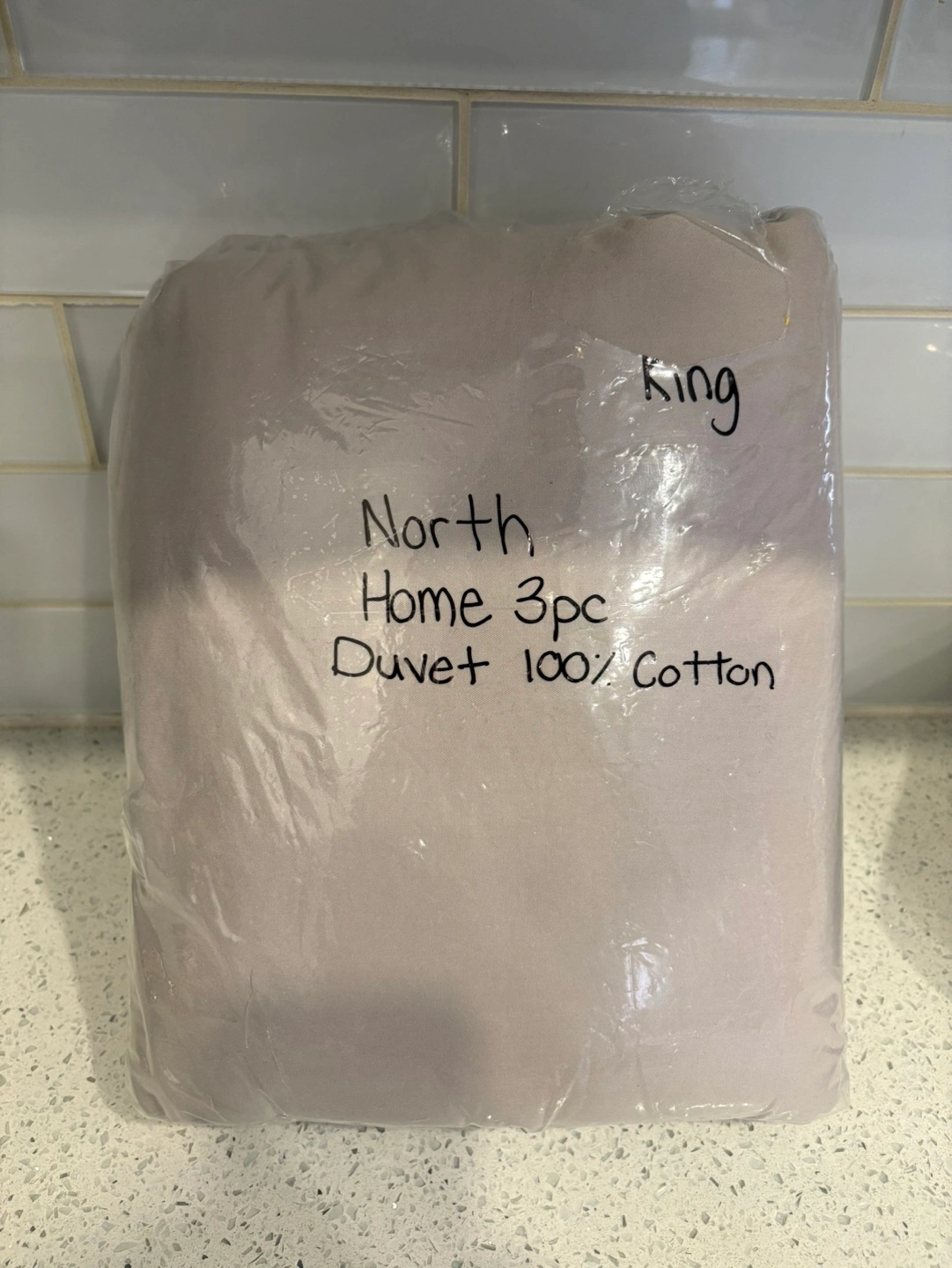 Brand new, never used. King size duvet cover set. Includes one duvet cover and two pillow shams. 100% combed cotton. Grey colour. Soft and comfortable.