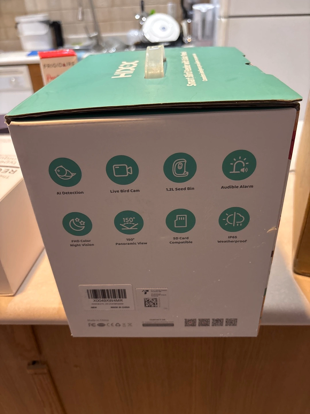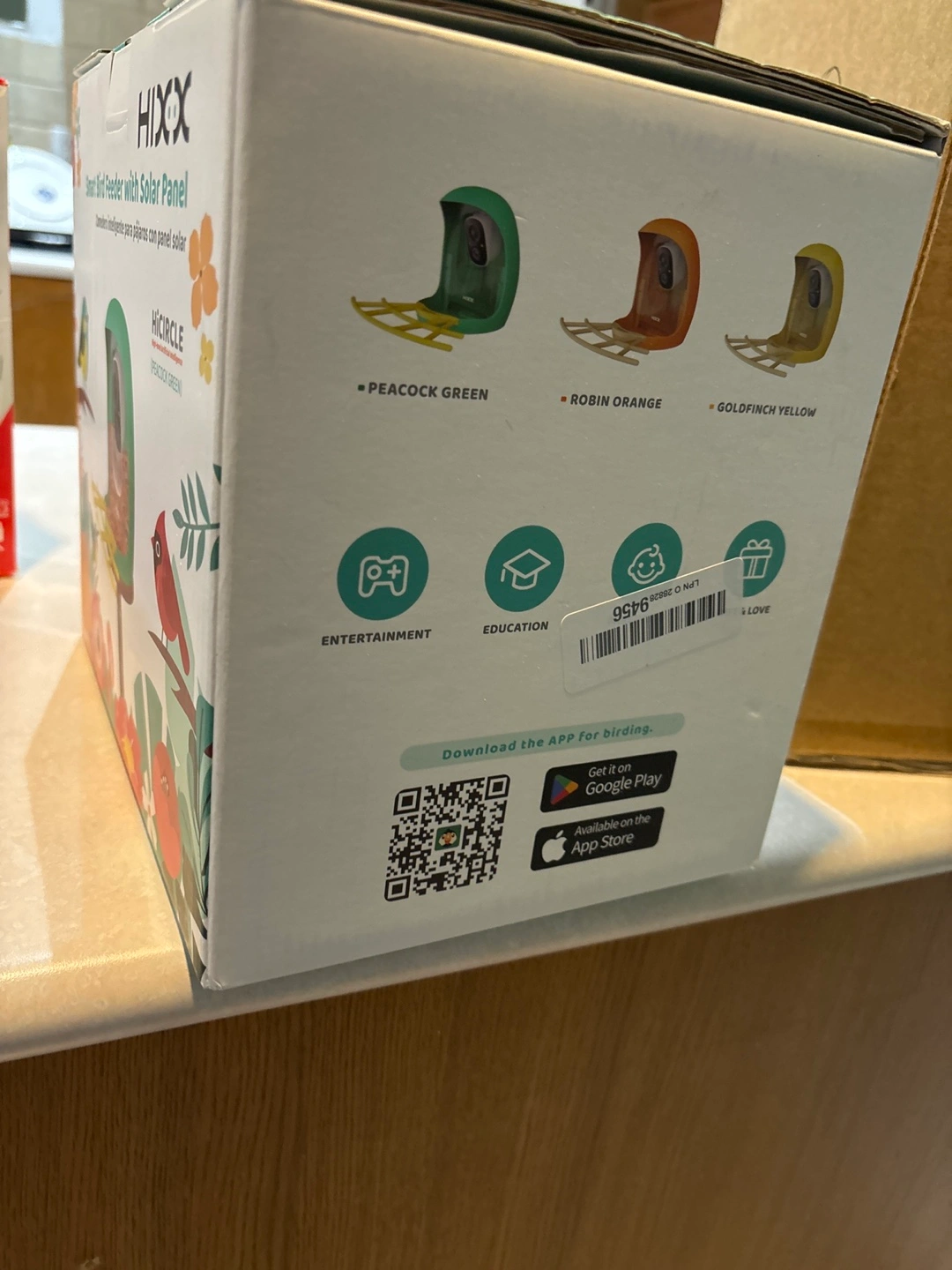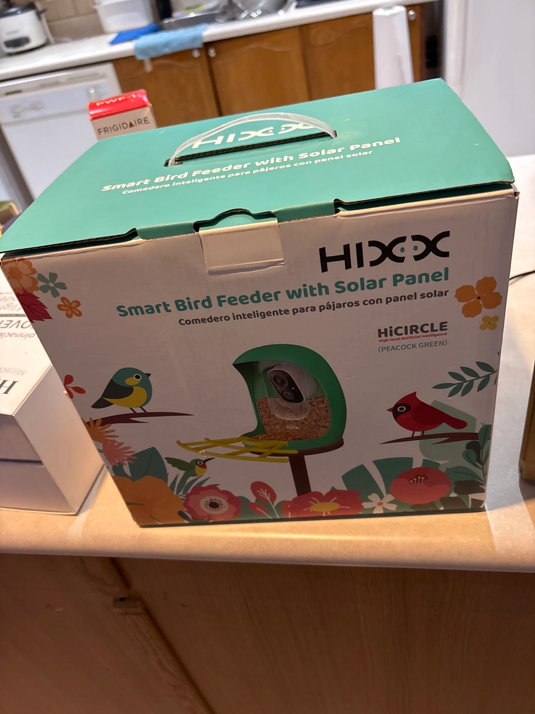 Smart bird feeder. Features AI detection, live bird cam, 1.2L seed bin, audible alarm, FHD colour night vision, 150° panoramic view, SD card compatible, and IP65 weatherproof design. Includes solar panel. New in box.