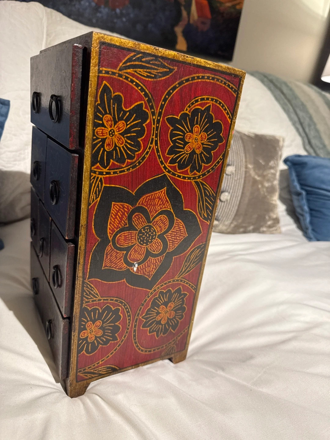 Pier one Nine-drawer organizer. Dark red and gold finish. Floral pattern. Small size, ideal for jewellery or other small items. Unique design.