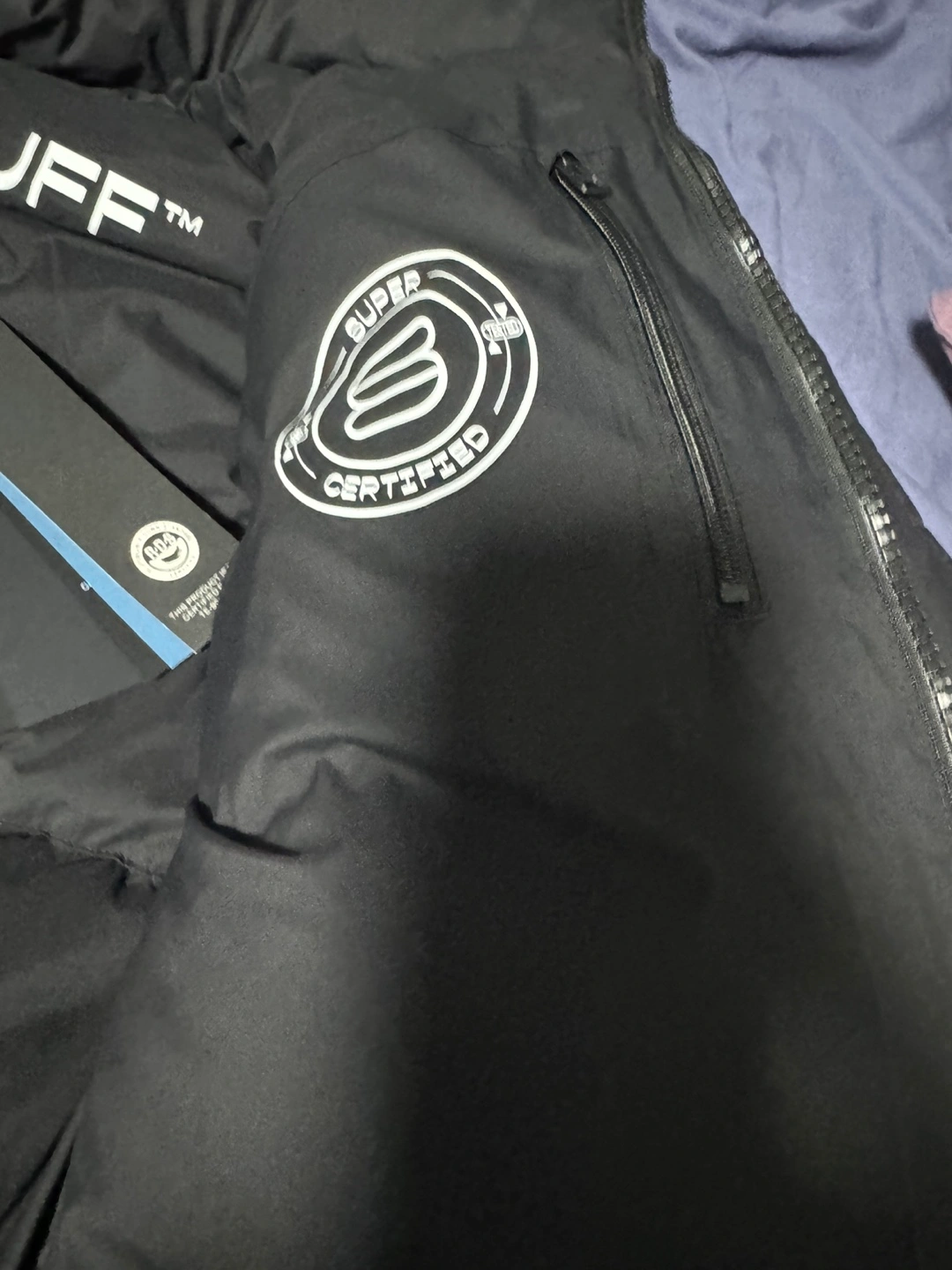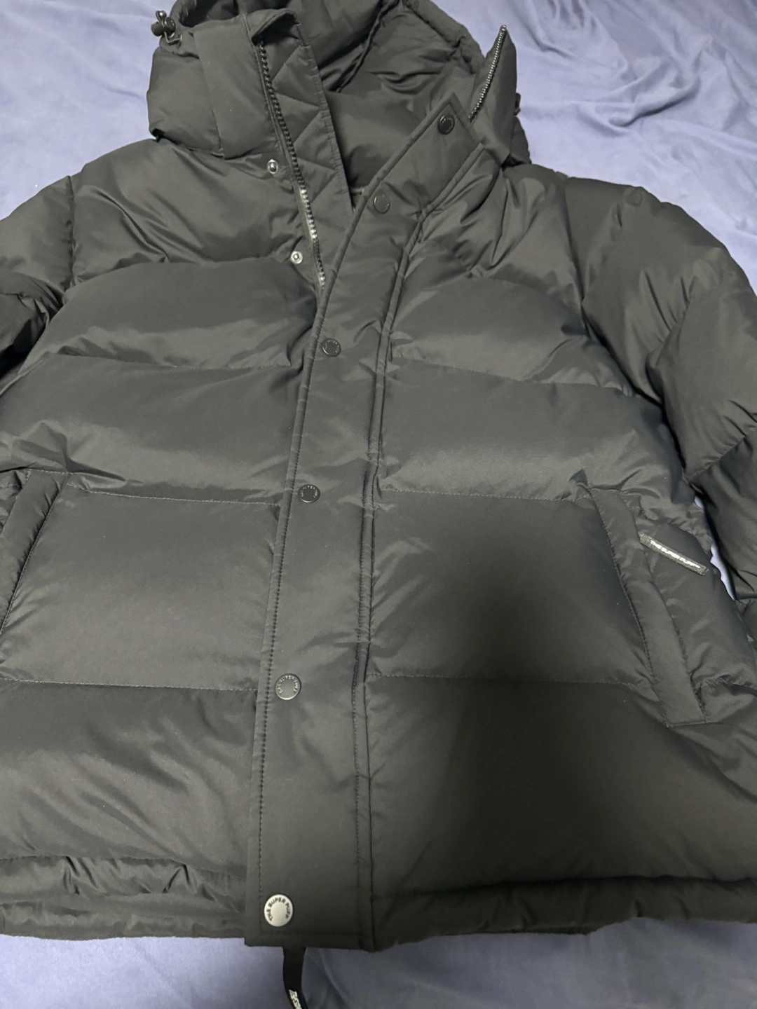 Black Aritzia Super Puff cliMATTE puffer jacket. Size medium. Features a hood and zipper closure. Excellent condition.