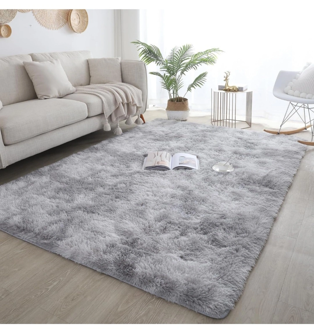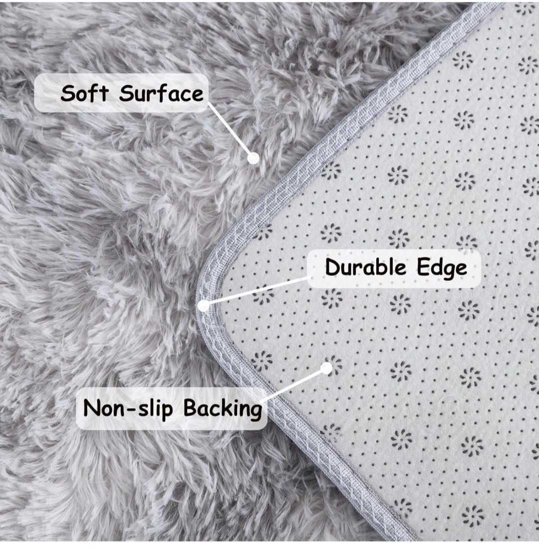 Luxurious grey rug. Soft, fluffy texture. Durable edges and non-slip backing. Perfect for living room or bedroom.
