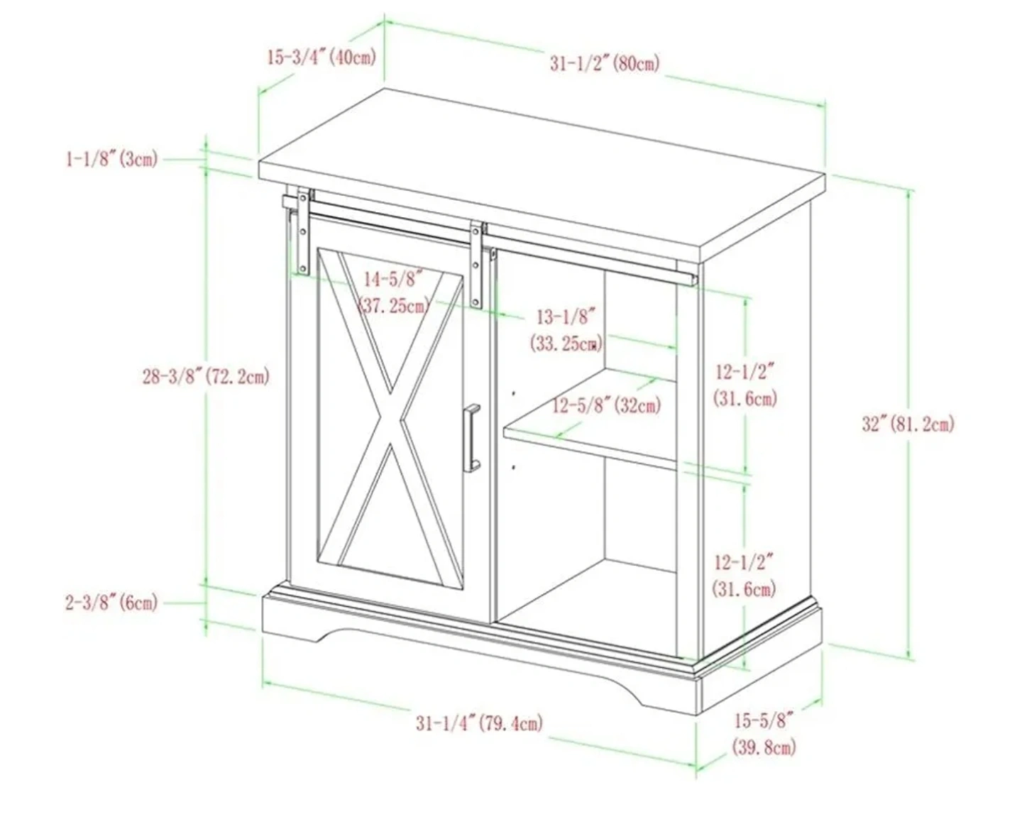 Rustic grey wash finish. Sliding barn door with an X design. One shelf. Perfect for storage.
