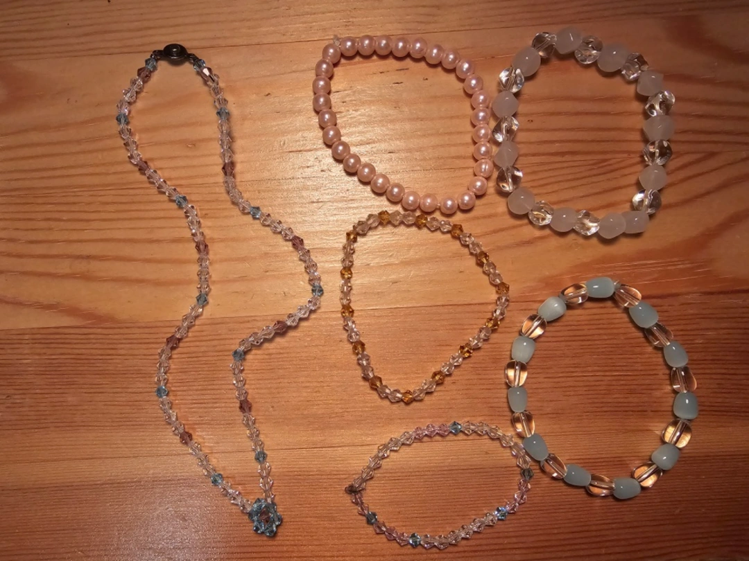 Beautiful set of five delicate bracelets and one necklace. Various colours and styles with crystal and pearl accents. Great for layering or individual wear! Would be great for kids as the bracelets are elastic 😍