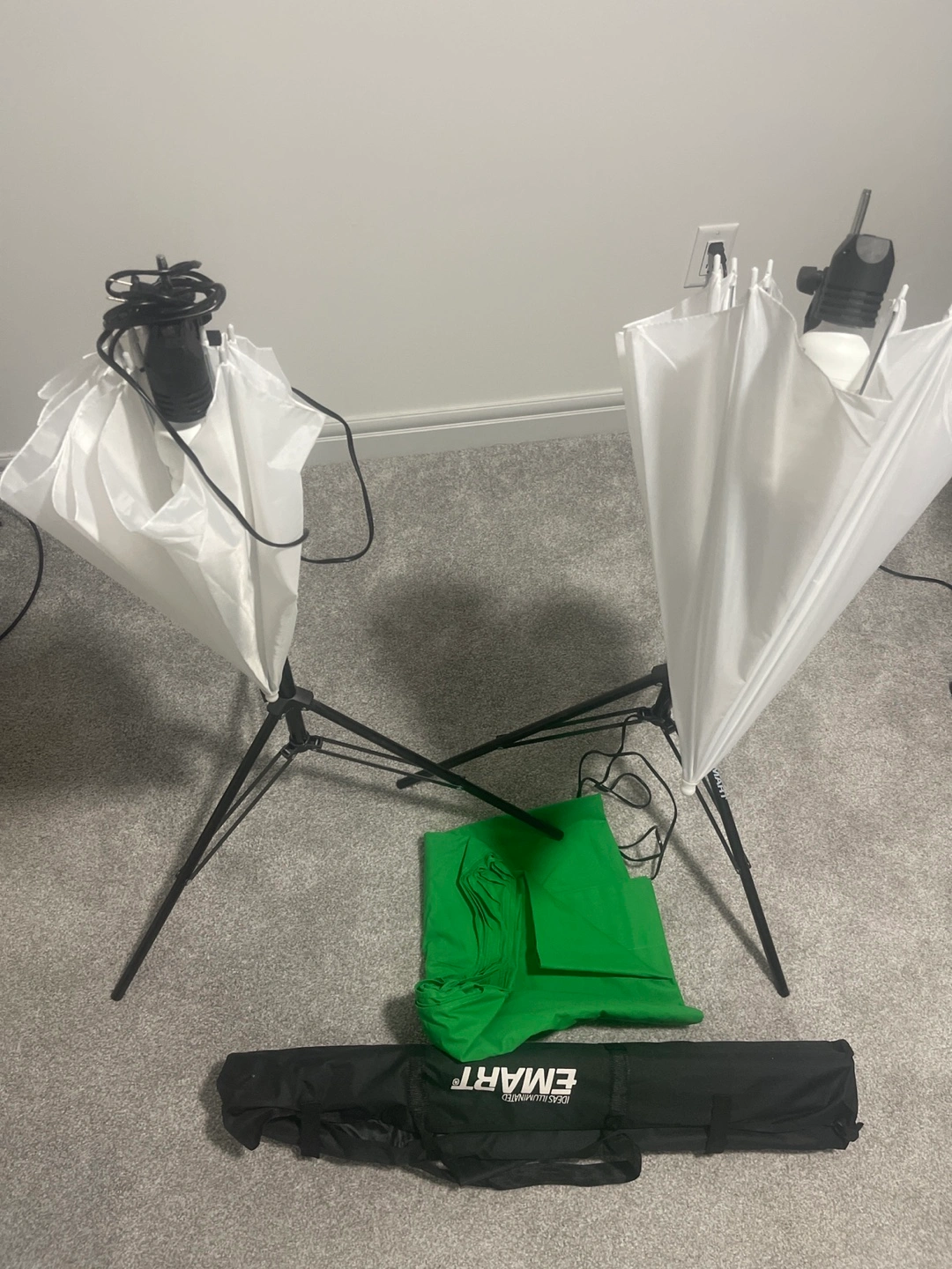 Two softbox lighting kits, stands, and green screen. Includes carrying case. Great for portraits or product photography. Used only once. Comes with lamps.