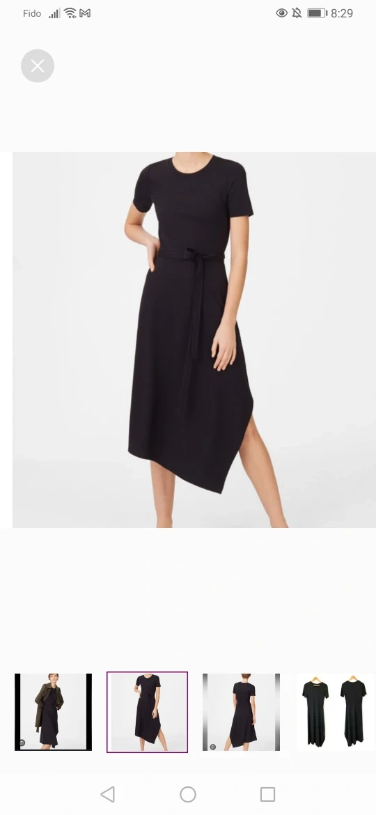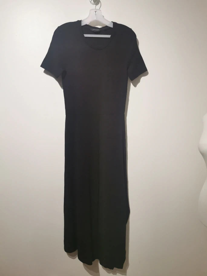 Black midi dress. Asymmetrical hem. Short sleeves. Simple, elegant style.