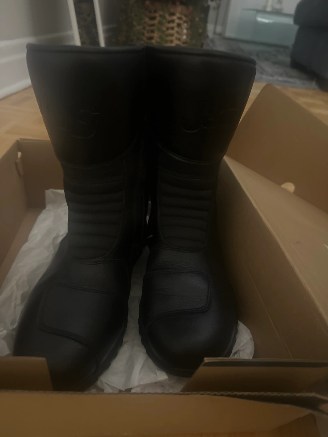 Pair of men's black leather motorcycle boots. Size 9 UK/43 EU. Appear to be new in box. Features include leather construction and protective elements.