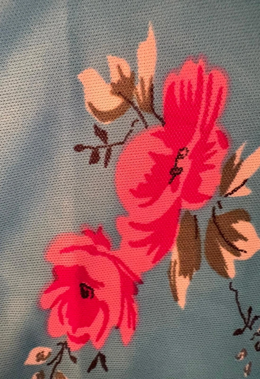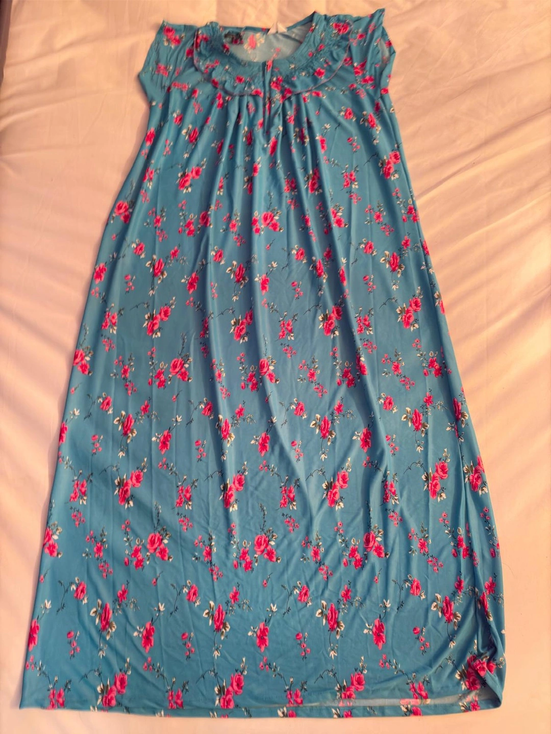 Pretty blue floral nightgown. Short sleeves, knee-length. Soft material, comfortable for sleeping. Small neckline.