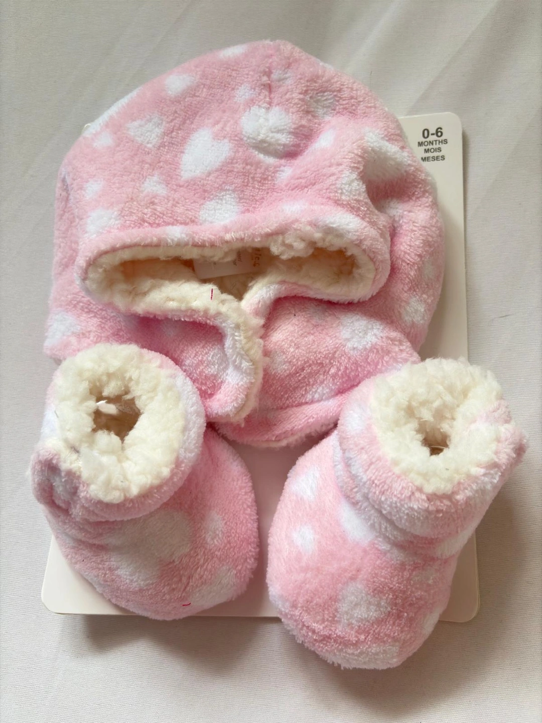 Adorable pink polka dot baby hat and bootie set. Soft lining. Size 0-6 months. Perfect for newborns. Original package