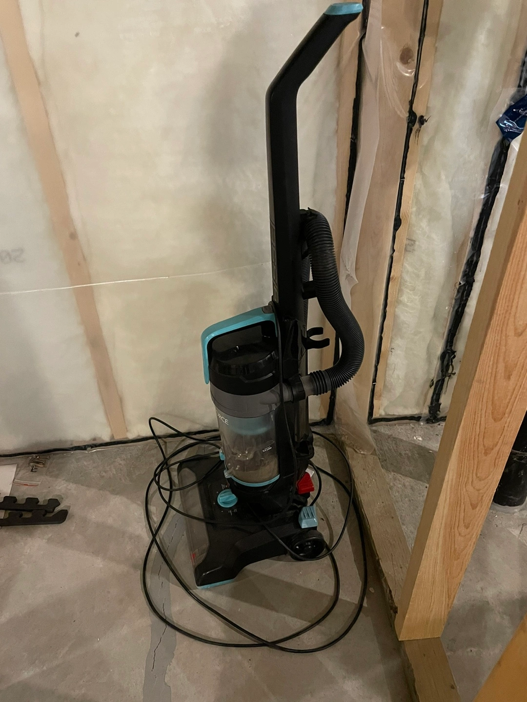 Upright vacuum cleaner. Light blue and black. Power cord included. Some dust visible inside canister.