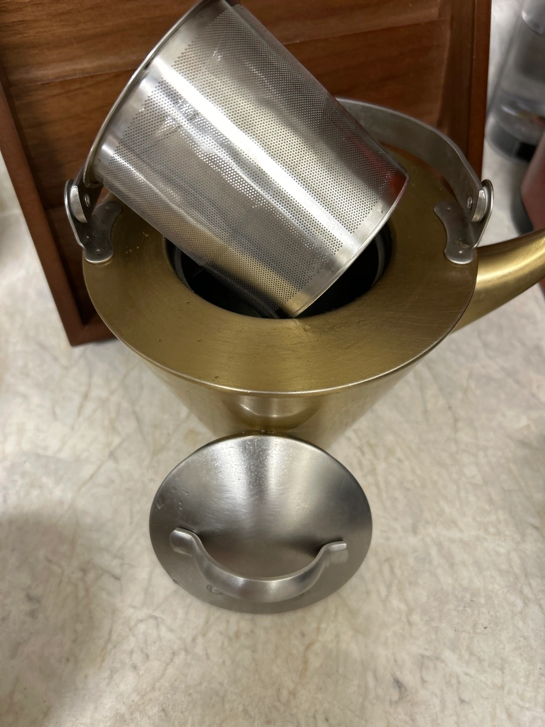 Gold-tone teapot. Stainless steel lid and infuser. Elegant design. Perfect for tea lovers.