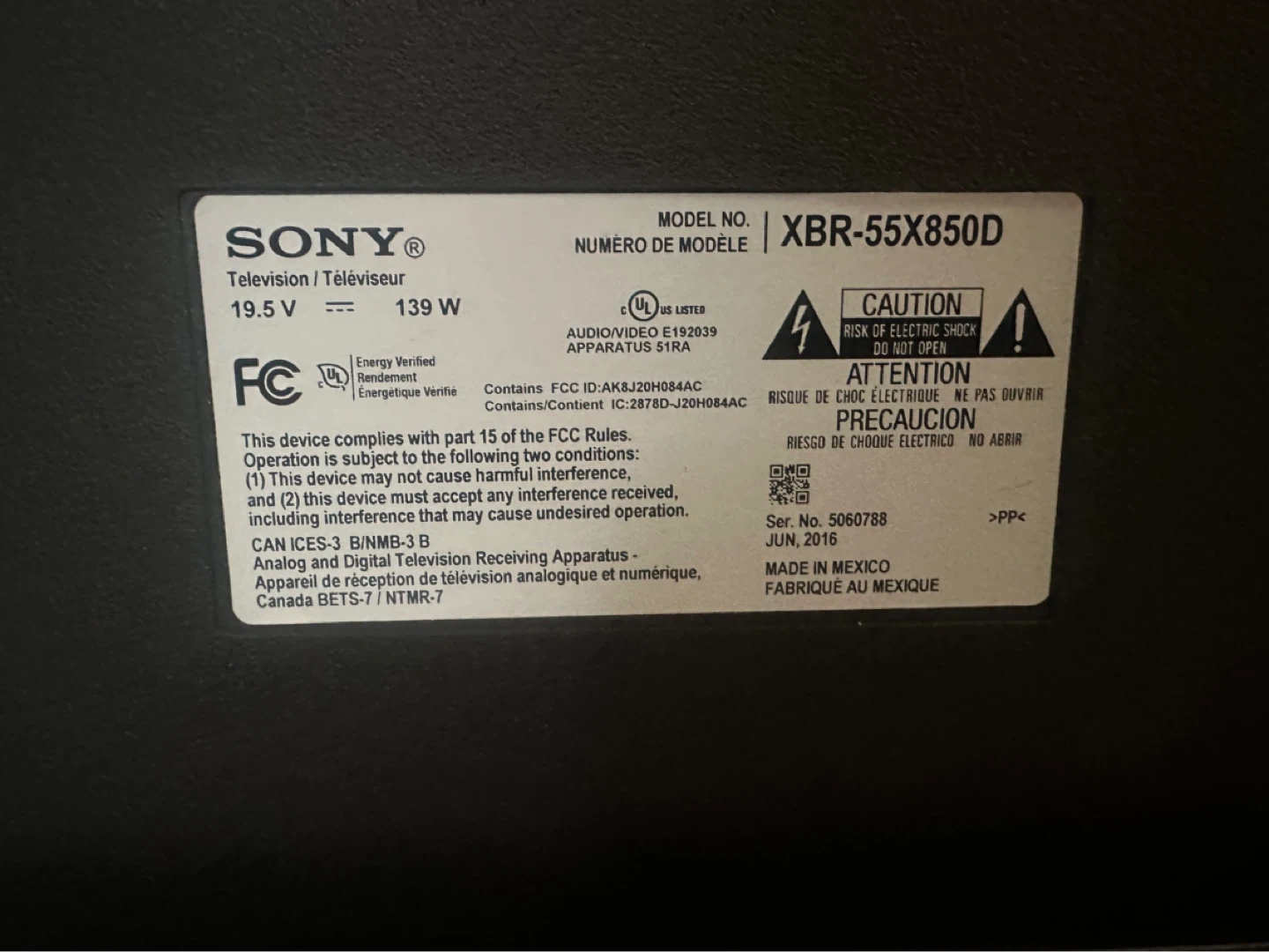 Sony television, model XBR-55X850D. It's a 55-inch. Smart 4K TV manufactured in June 2016. Like new in excellent condition. Come with remote.