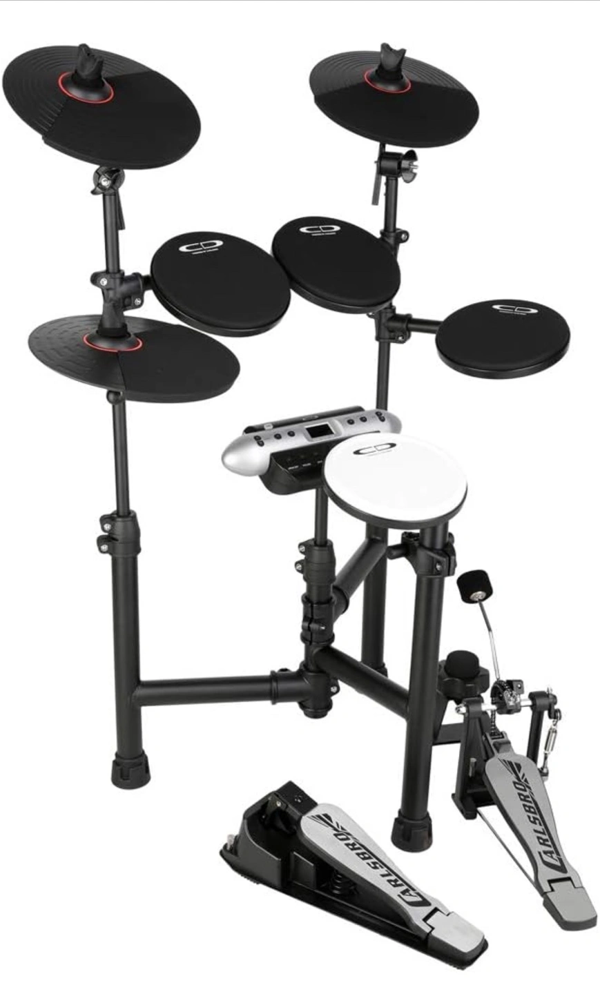 Complete electronic drum kit. Includes drums, pedals, and sticks. Great for practicing or performing.