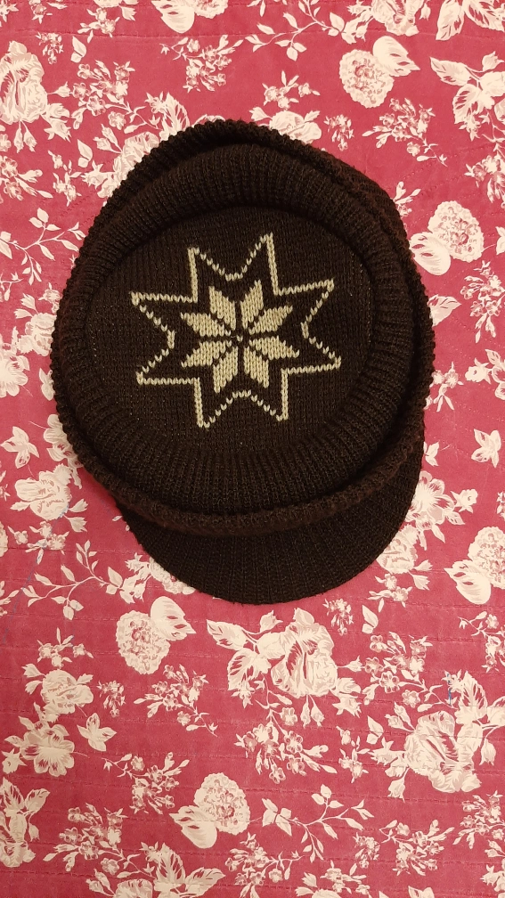 552Warm winter newsboy cap. Brown colour with a beige snowflake pattern. Knitted material. Suitable for cold weather.