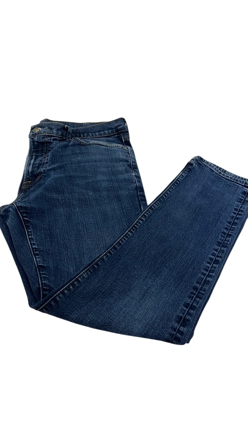 Dark wash denim jeans. Slim straight fit. Classic five-pocket styling. Button fly.
