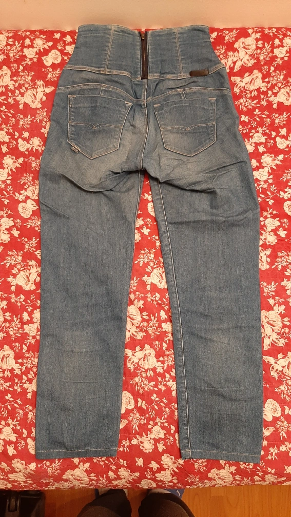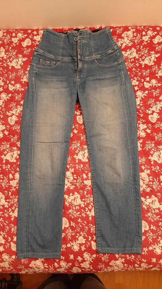 Women's high-waisted jeans with 2 front and 2 back pockets. Light wash denim. Features a back zip and front buttons closure. Comfortable fit. Gently used, but in Excellent condition.