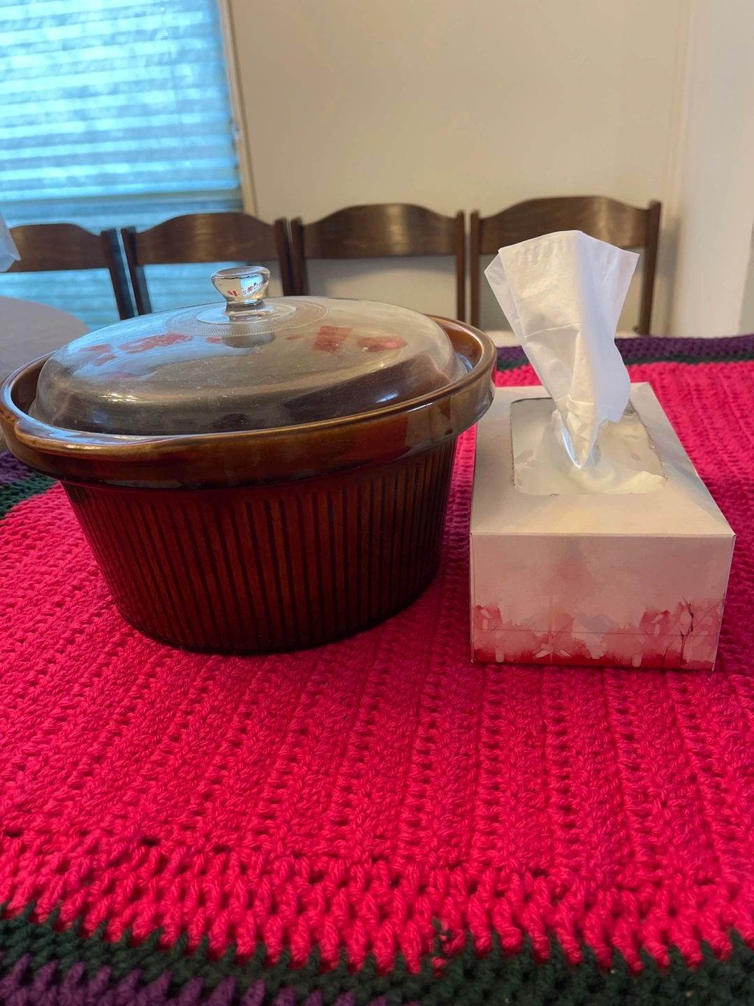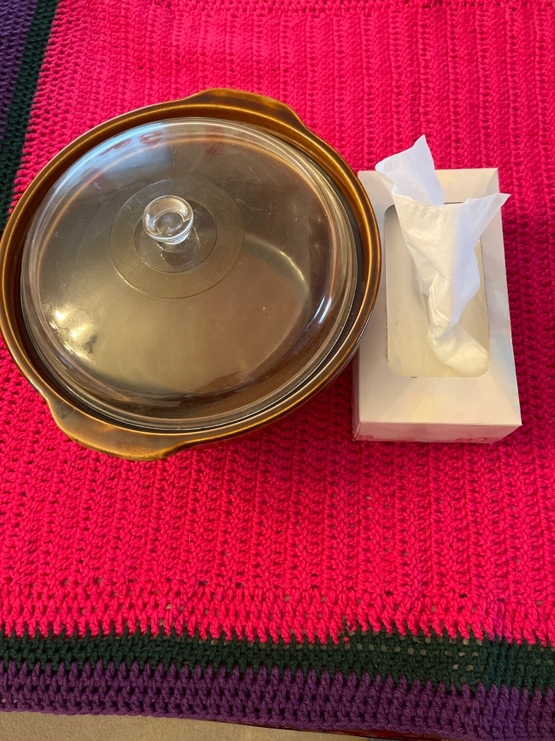Large, brown ceramic slow cooker. Glass lid included. Excellent for stews and casseroles. Box of tissues for size comparison only.
