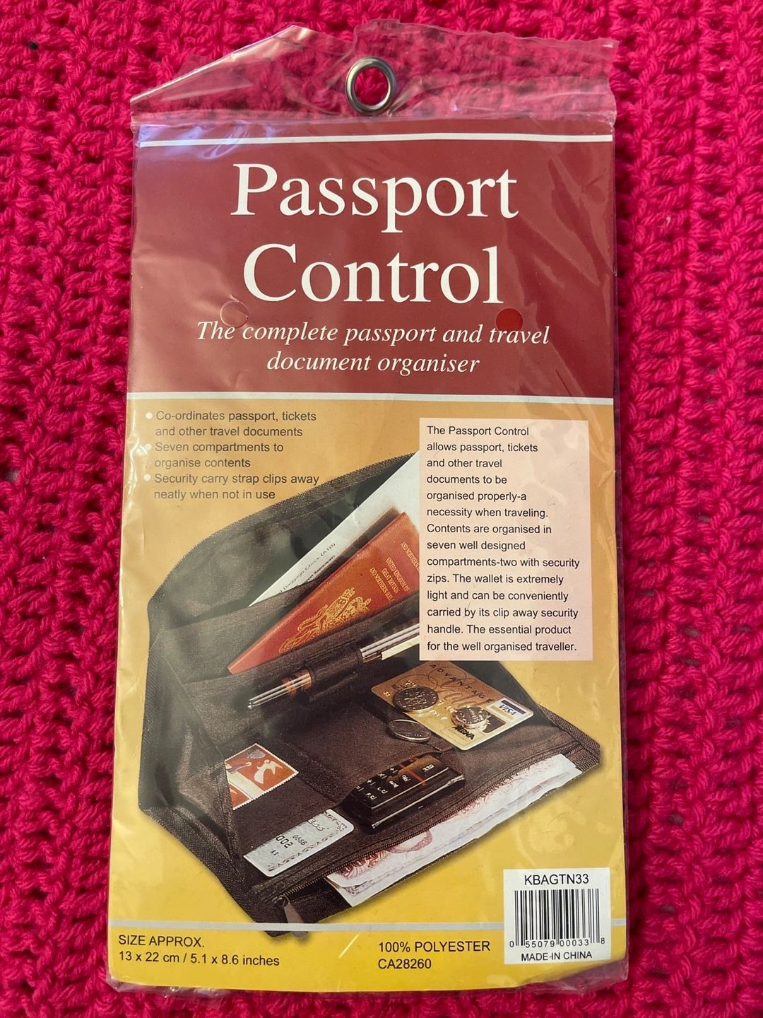 Black polyester travel document organiser. Multiple compartments. Security strap. Size approx. 13 x 22 cm / 5.1 x 8.6 inches. New, in packaging.