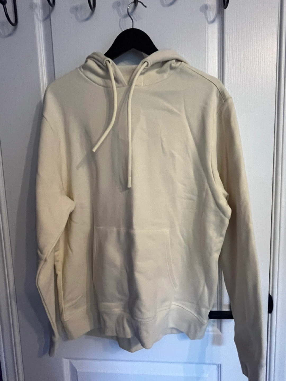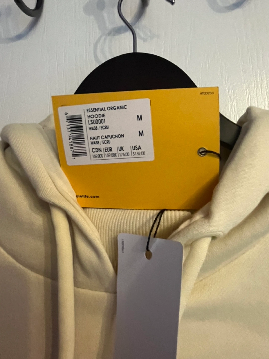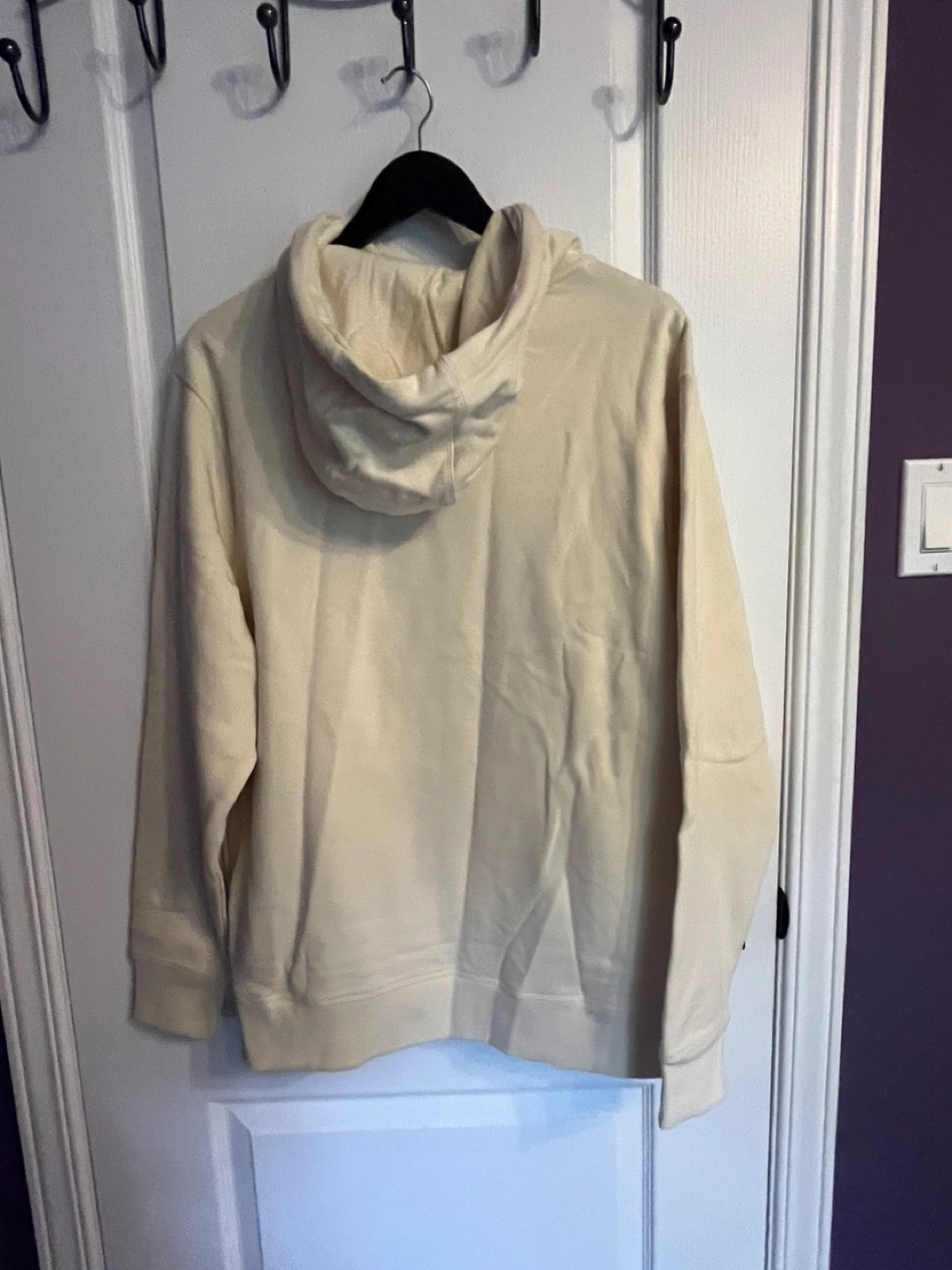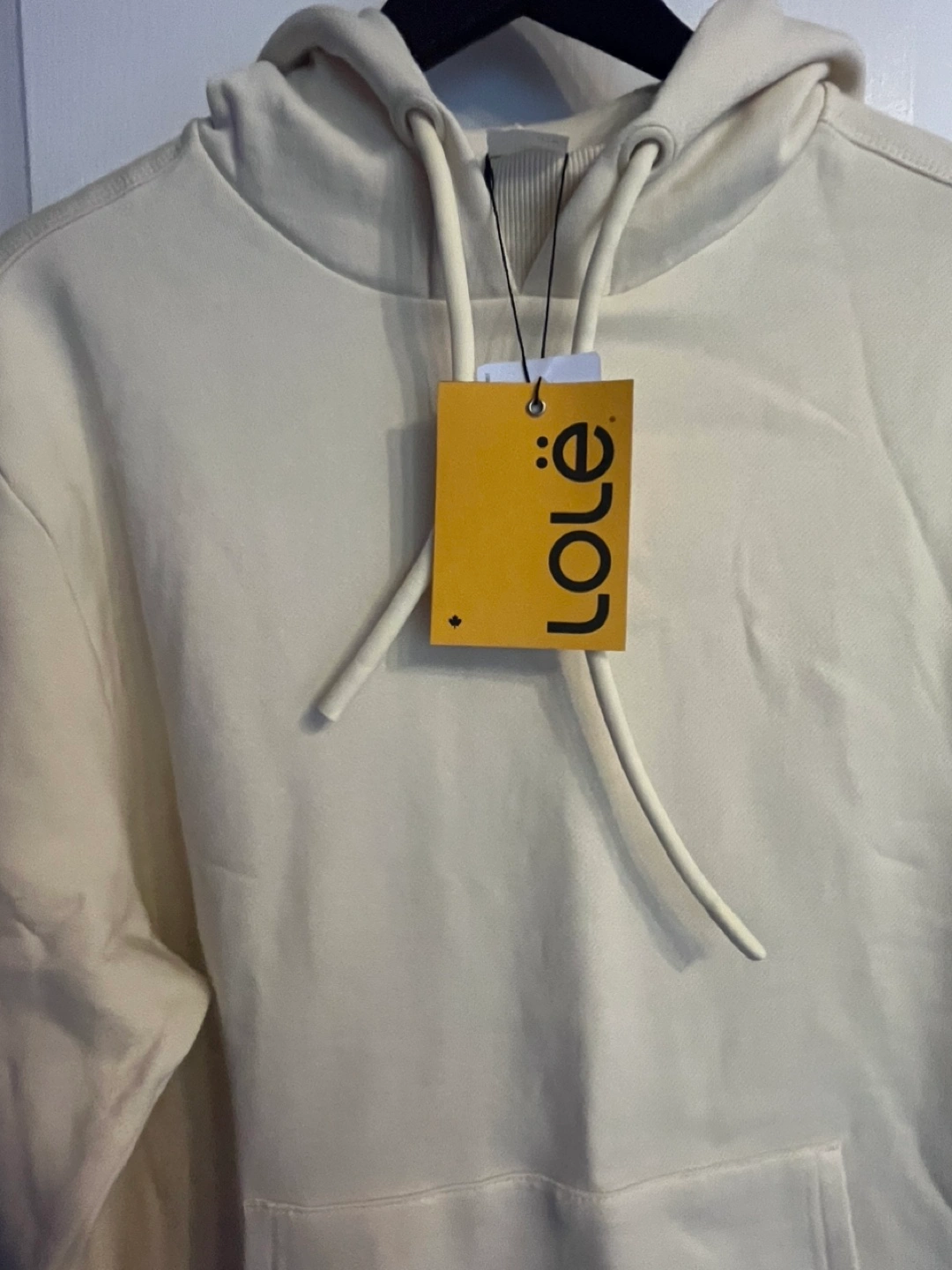 Cream-coloured Lole hoodie. Size medium. Long sleeves, kangaroo pocket, drawstring hood. New with tags. Regular $159.